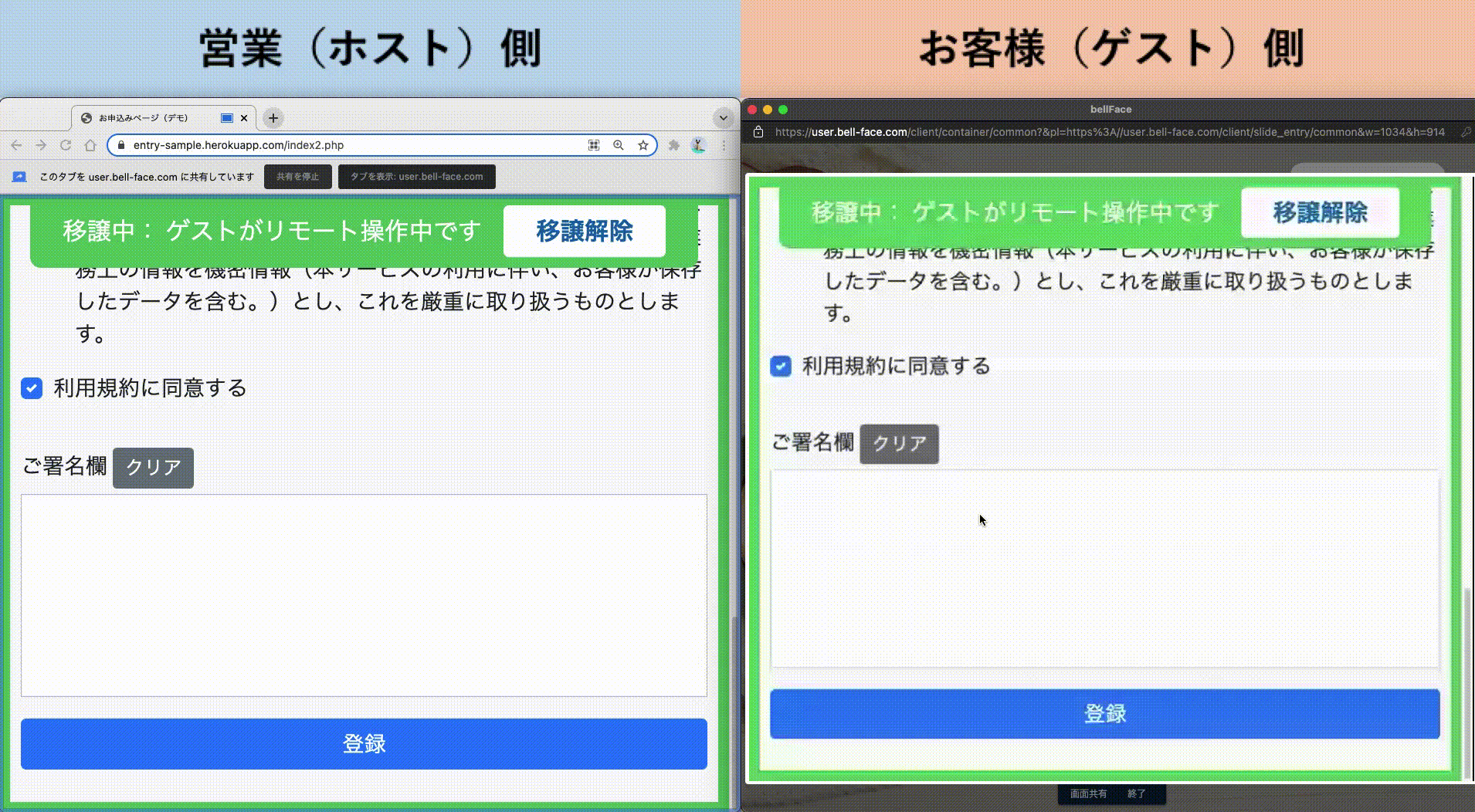 本機能は、営業担当者が自身のPCにて申し込み画面を表示し、一時的にお客様へ営業担当者の画面の操作権限をお渡し、お客様に入力いただくことで、その場でお申し込みや署名が可能となるものです。従来の対面での捺印や書類郵送の手間なく、申し込みまでがオンラインで完結できます。(特許出願中)
