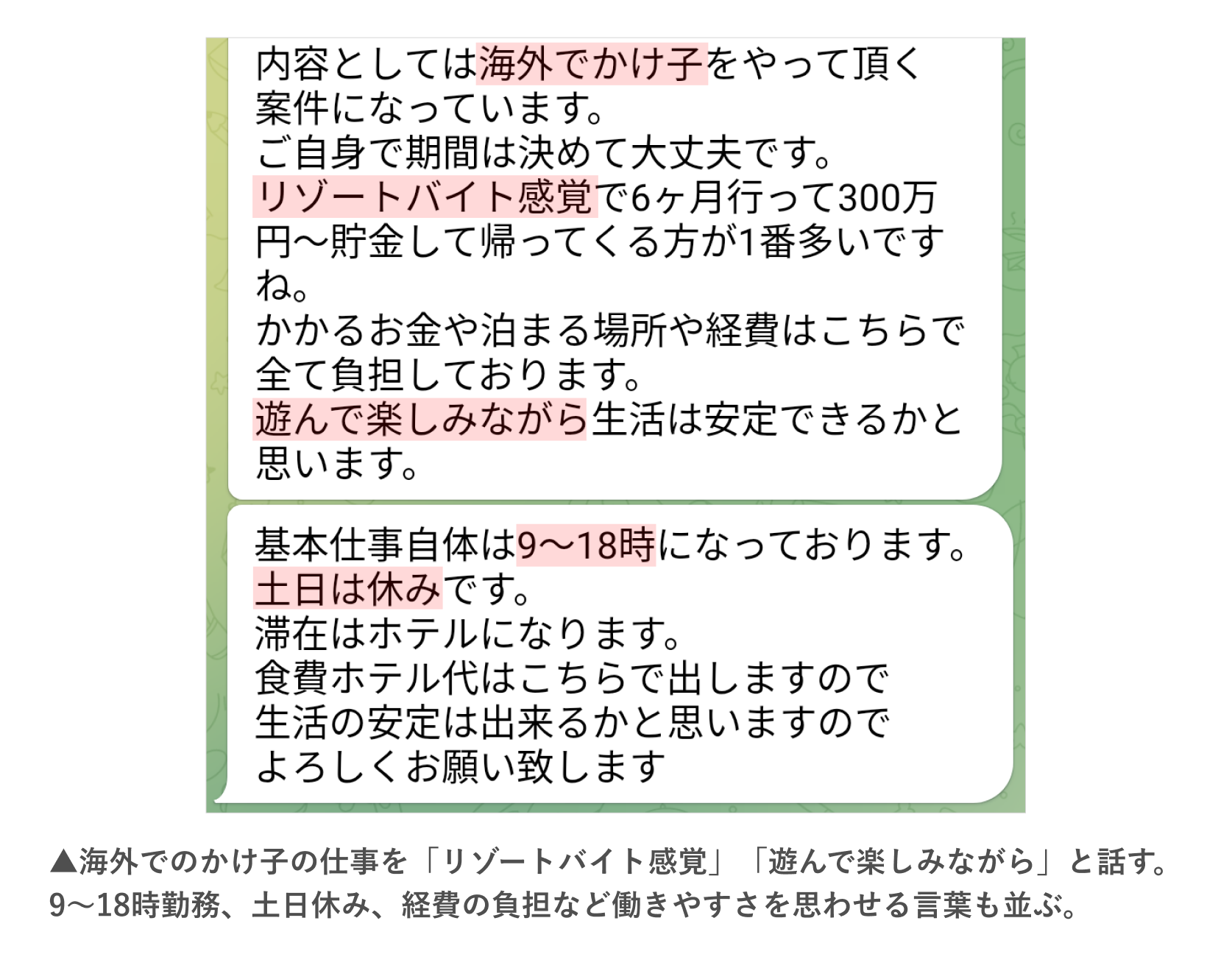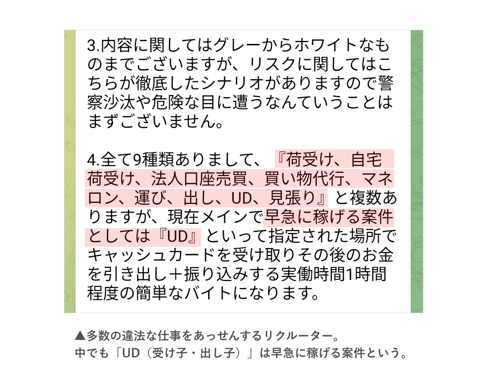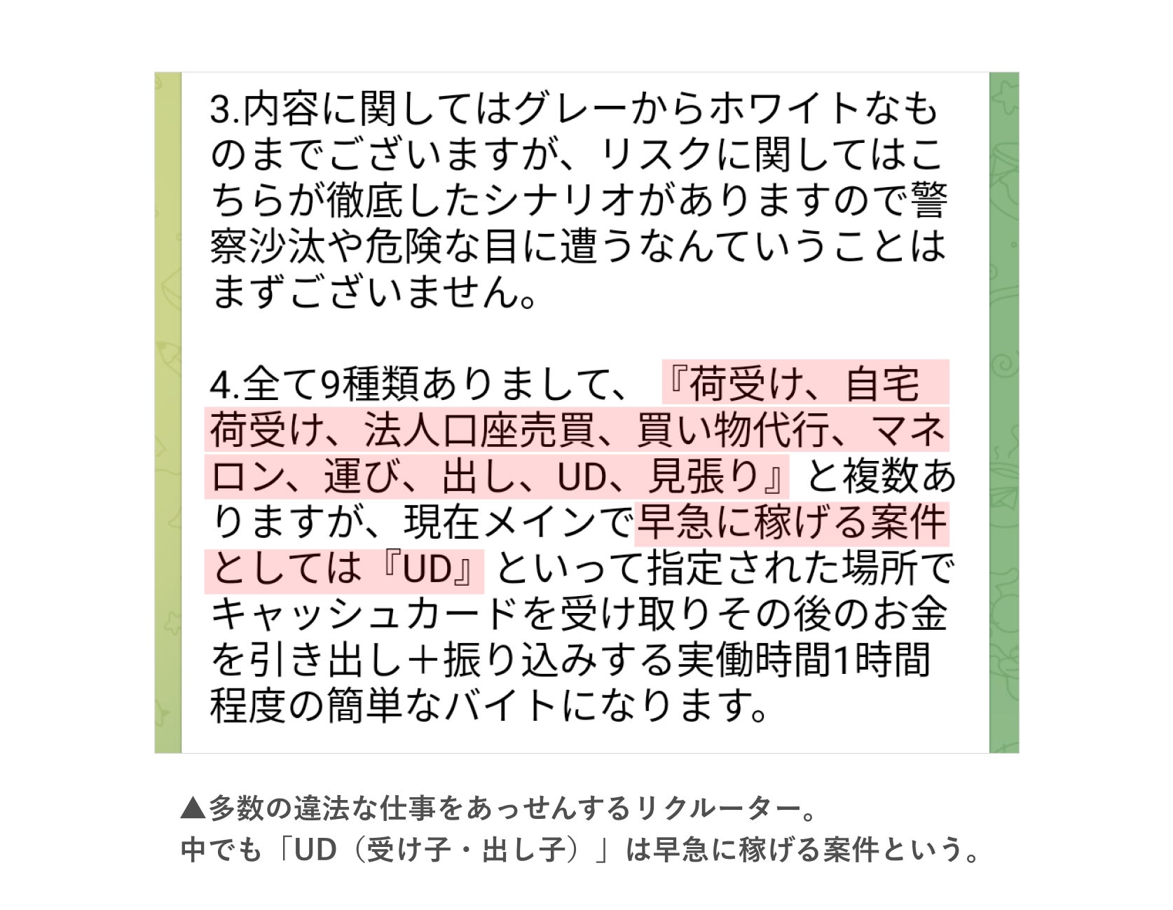 「早く稼ぐならUD」「海外でかけ子 リゾートバイト感覚で」リクルーターとのやり取り