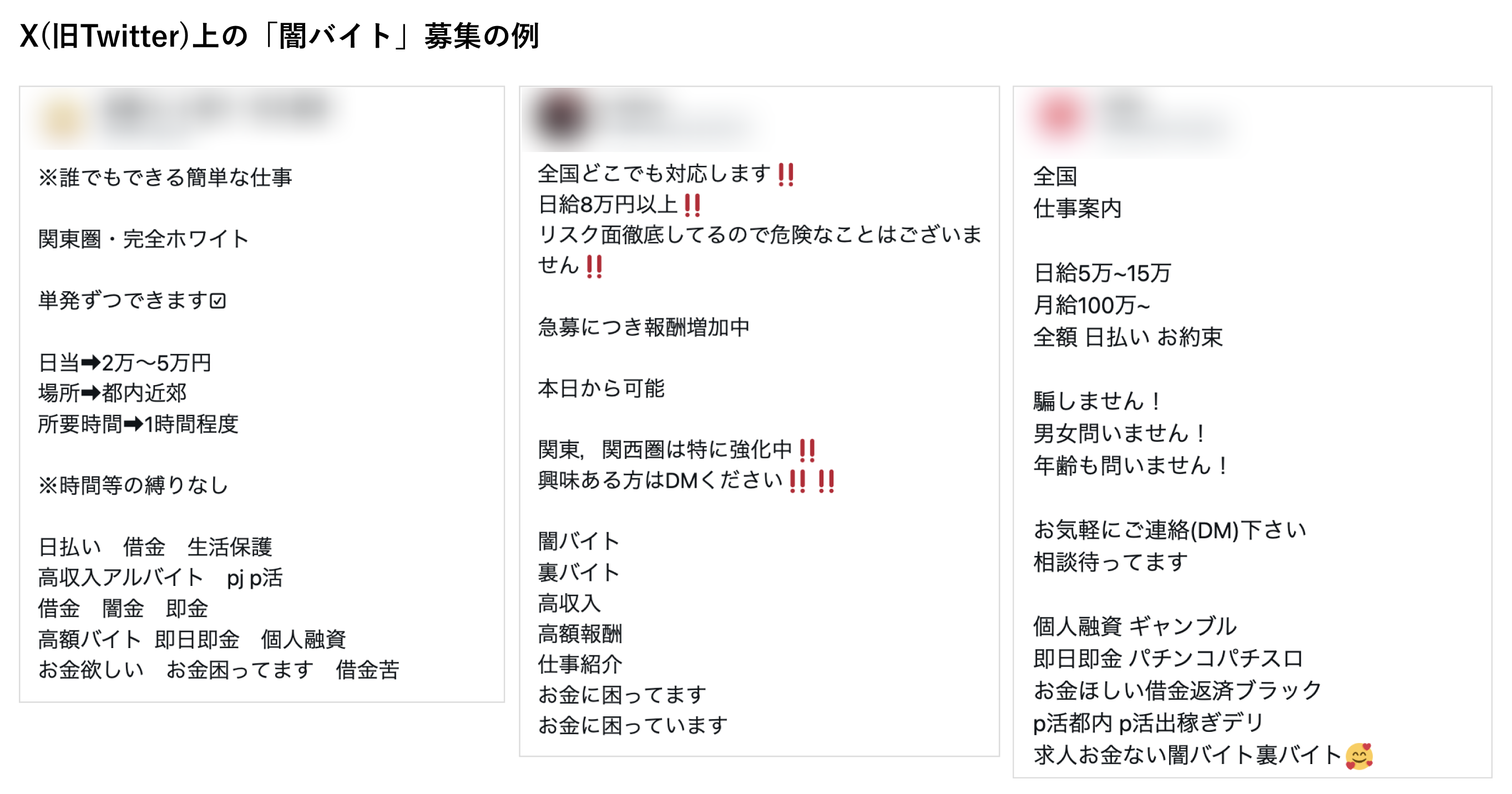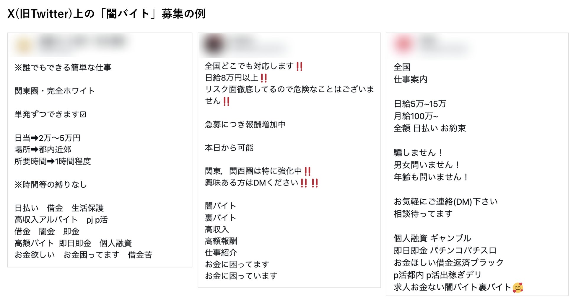 X(旧Twitter)などのSNS上には、闇バイトの募集に関する様々な投稿があります。