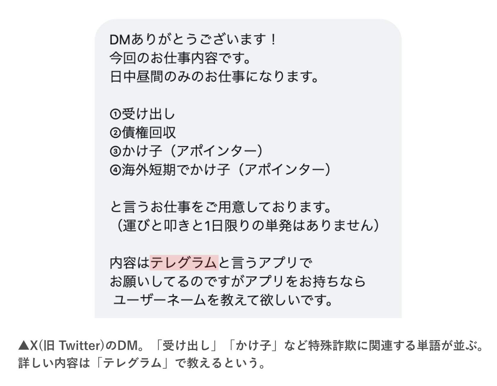 闇バイトの募集に対してダイレクトメッセージ(DM)でコンタクトを取ると、多くの場合は秘匿性の高いメッセージアプリ(Telegram、Signal等)でやり取りを求められます。秘匿性の高いメッセージアプリに移動した後、リクルーターから仕事の詳細な内容や、参加に際しての注意事項等が説明されます。メッセージアプリの通話機能を使い、詳細の確認等をする場合もあります。