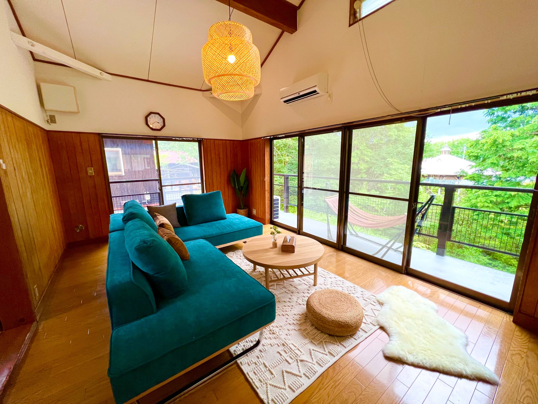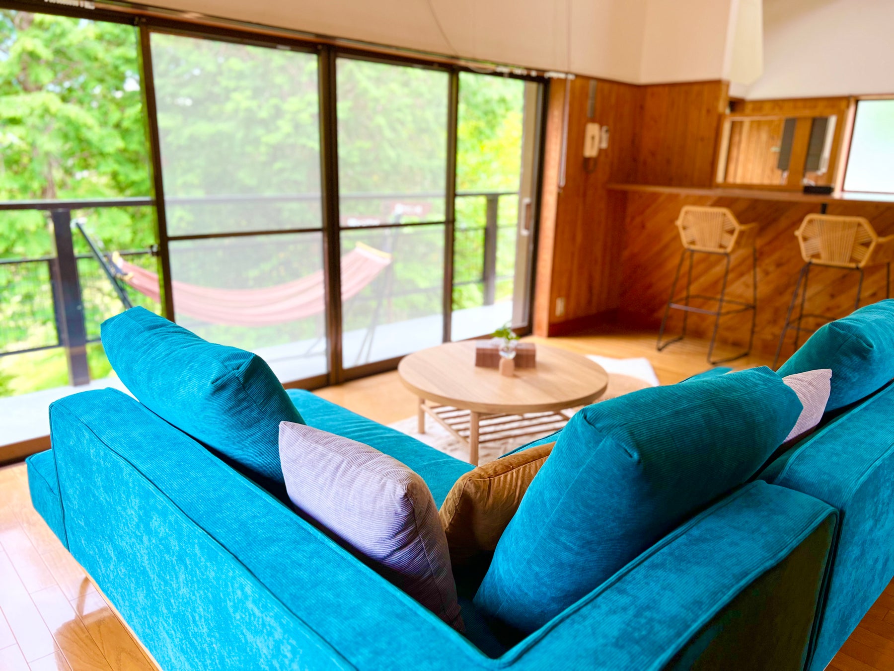 緑にかこまれた開放的なお部屋では、ひだまりの中でお昼寝したり、ハンモックに寝転んで森林浴を楽しんだり......