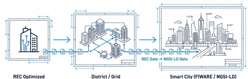 RECは、NGSI-LD(都市データ標準)との親和性が高いため、将来的にNGSI-LDとの連携により、 スマートシティ・パワーグリッド(都市OS)へシームレスに展開が可能となれば、建物単体ではなく都市全体のエネルギー需給を最適化する仕組みへの接続も視野に入れることができると考えられます。