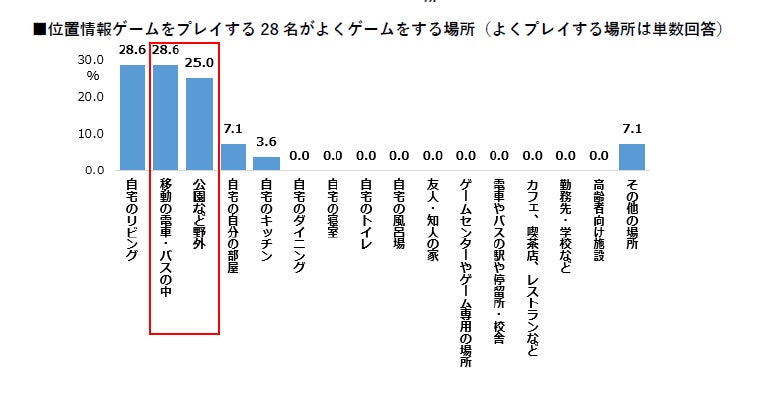 ⇒位置情報ゲームのみ、「移動の電車・バスの中」、「公園などの野外」といった屋外プレイ率が高い。