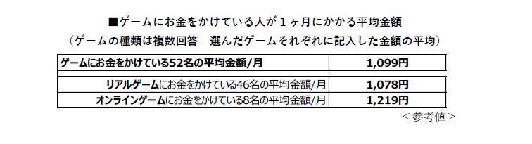 ・月にかける金額をたずねたところ、52名の平均は1,099円。リアルゲームへは1,078円、オンラインゲームへは、1,219円で、母数が少ないため参考値となるが、オンラインゲームの方が平均額がやや高い。