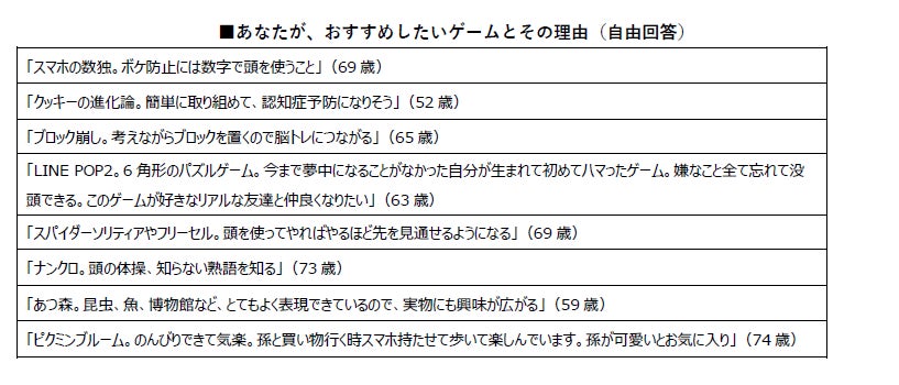 ・おすすめしたいゲームとその理由をたずねると、頭を使うゲームをボケや認知症の予防にプレイしているコメントが目立つ。頭を使うゲームを、ボケや認知症を予防するためにプレイしているシニア女性が多い。