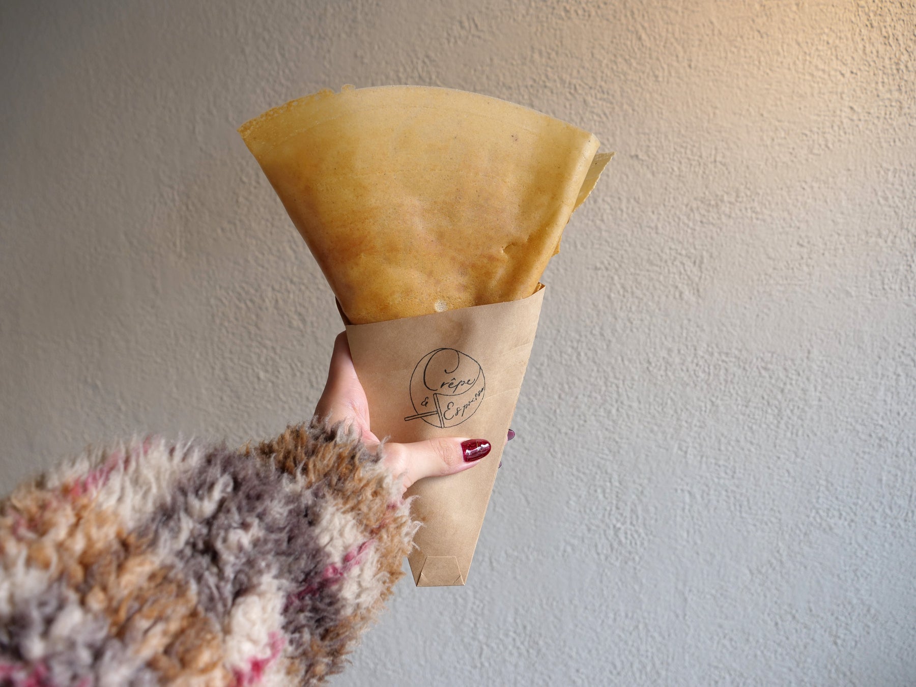 表参道や嵐山に構える「クレープとエスプレッソと」は、パリパリ、サクサクとした軽やかな⾷感と、クッキーのような⾹ばしさが特徴の「⻩⾦クレープ」を提供しています。