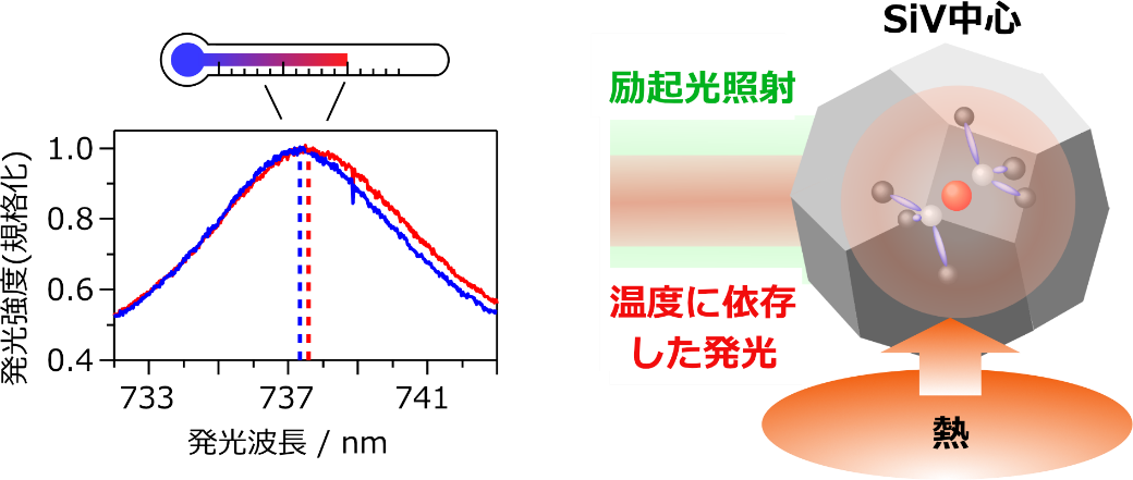図: SiV中心爆轟ナノダイヤモンドの温度を変えながら発光スペクトルを測定し、発光の中心波長の温度依存性を調べる。