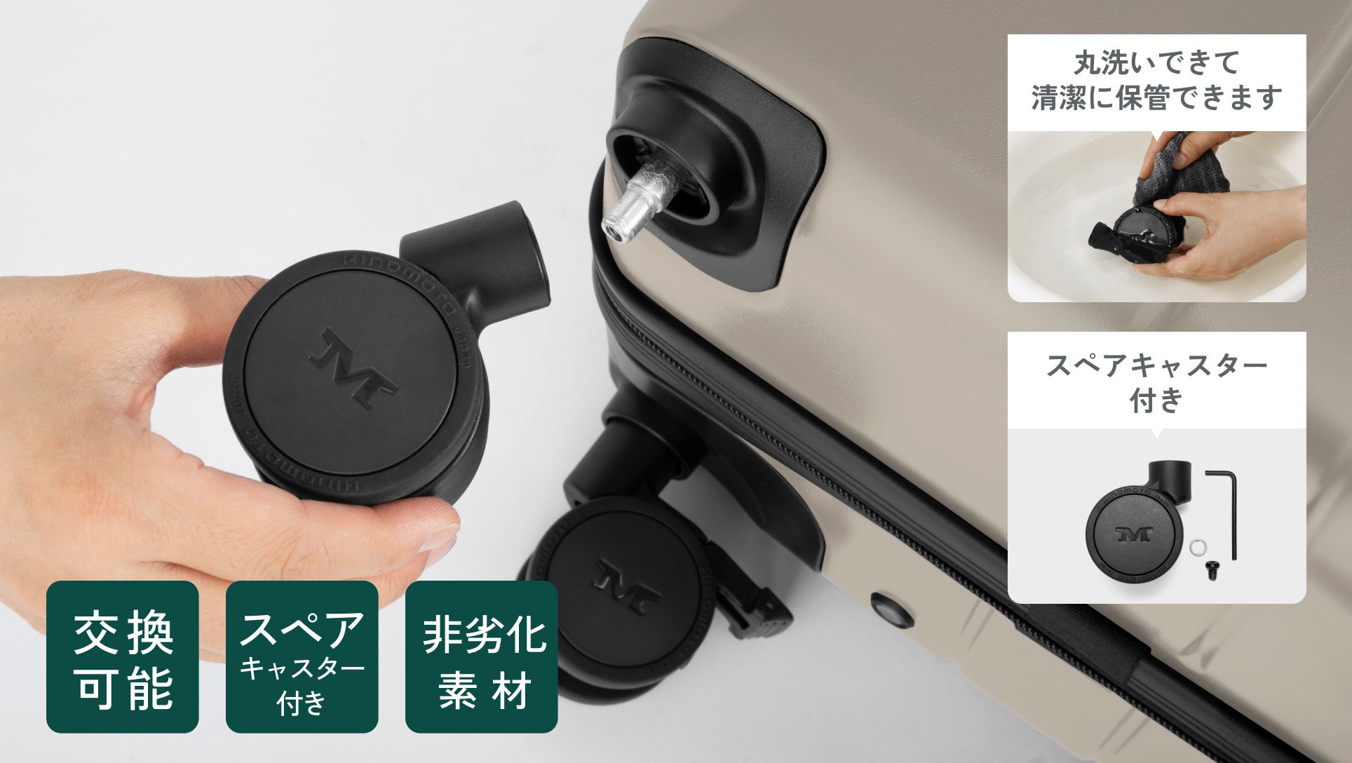 付属の六角レンチで簡単にキャスターを取り外し可能。加水分解による劣化を一切起こさないため、汚れたときは丸洗いできます。またスペアキャスターが1個付属。キャスターの故障でスーツケースを買い替える必要がなく、長く快適にお使いいただけます。