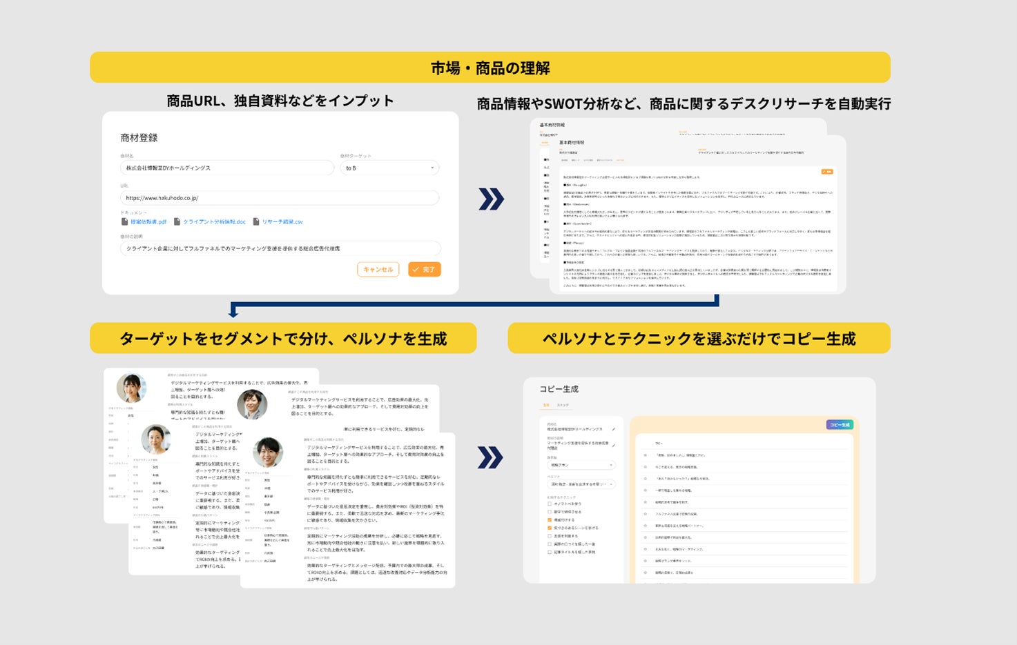 AI機能を利用した「市場/商材理解」「顧客セグメント/ペルソナ生成」「訴求軸生成」を行うことで、クリエイティブプラニングの初期の戦略立案の工数を大幅に短縮します。さらに博報堂DYグループが長年培ってきたマーケティング戦略立案の知見を活かしたAIによる提案をベースに、最終的にはプラナーやクリエイターの目でより良いコピーへと仕上げることにより、今までより圧倒的に少ない工数で、クオリティが高く幅広い訴求のプラニングが期待できます。