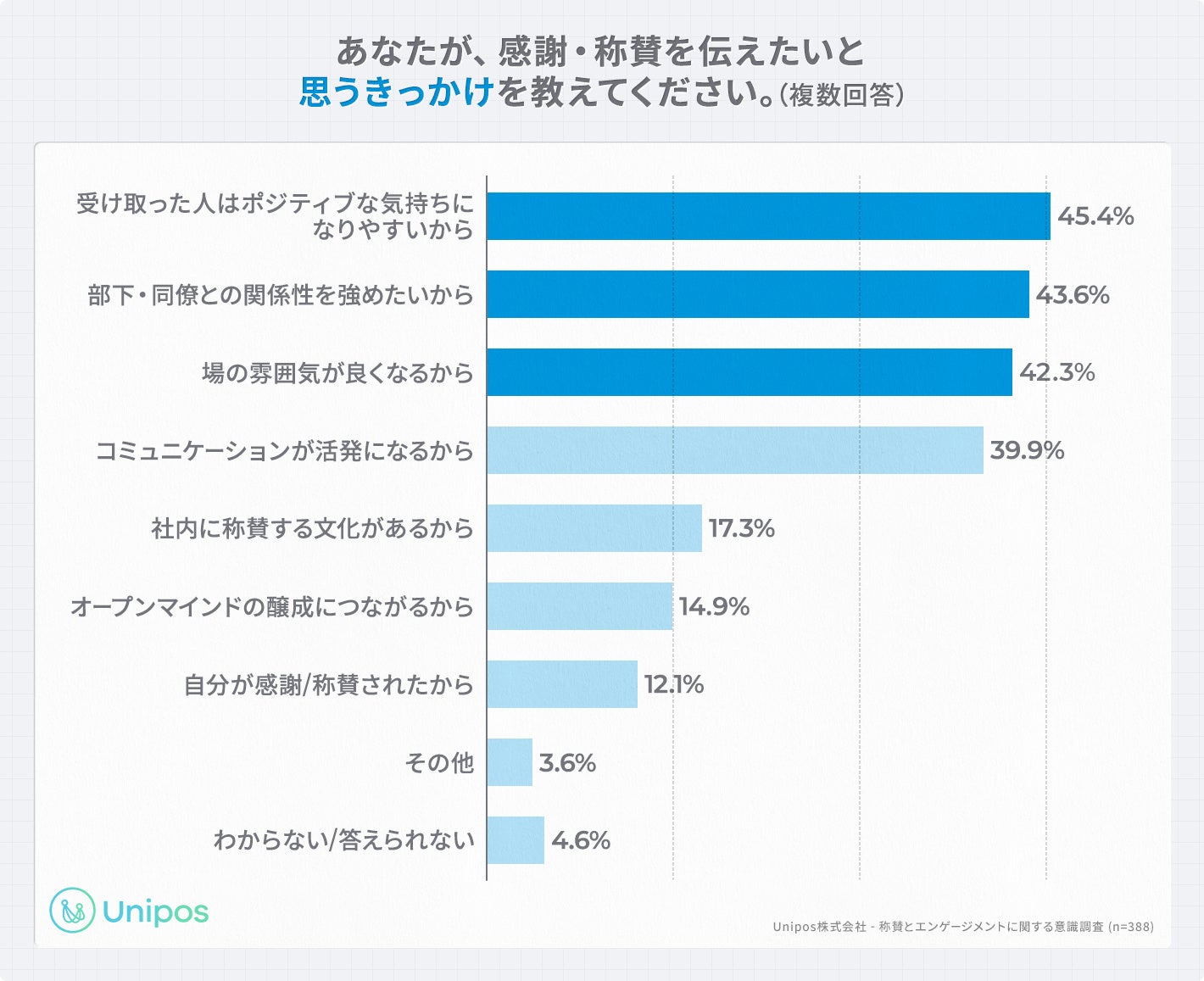 「月に1回程度」以上の頻度で感謝・称賛を伝えていると回答した方に、「あなたが、感謝・ 称賛を伝えたいと思うきっかけを教えてください。(複数回答)」(n=388)と質問したところ、第1位は45.4%で「受け取った人はポジティブな気持ちになりやすいから」となり、続いて「部下・同僚との関係性を強めたいから」が43.6%、「場の雰囲気が良くなるから」が42.3%という回答となりました。