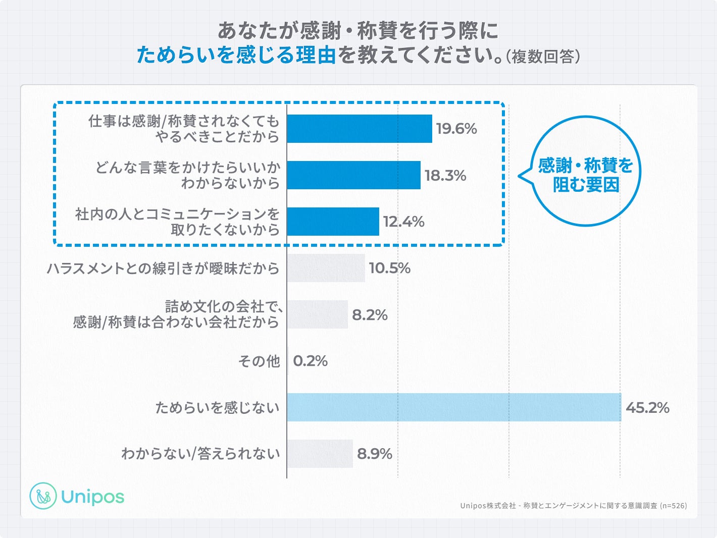 「あなたが感謝・称賛を行う際にためらいを感じる理由を教えてください。(複数回答)」(n=526)と質問したところ、45.2%の人が「ためらいを感じない」と回答しました。しかし前述の「7割以上が月1回以上感謝・称賛を伝えている」という結果から、感謝・称賛を伝えている人の中にもためらいを感じつつ伝えている人が含まれていることが伺えます。