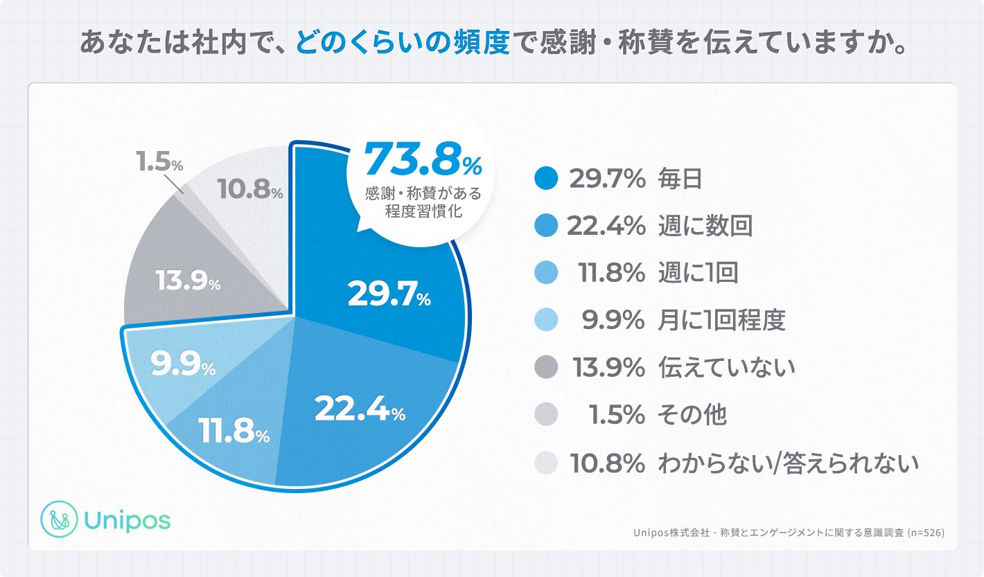 「あなたは社内で、どのくらいの頻度で感謝・称賛を伝えていますか。」(n=526)と質問したところ、「毎日」が29.7%、「週に数回」が22.4%、「週に1回」が11.8%、「月1回以上」が9.9%という回答となりました。感謝・称賛がある程度習慣化している人は全体の73.8%となり、当社としては非常に前向きに捉えられる結果となっています。