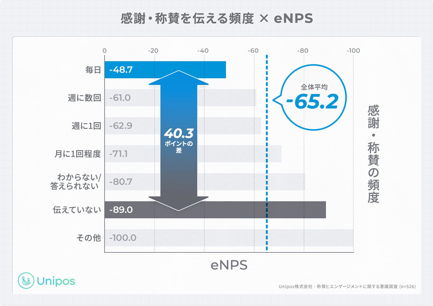 ポイント①:「感謝・称賛を伝えていない」層は「毎日伝えている」層よりeNPSが40.3ポイント低い