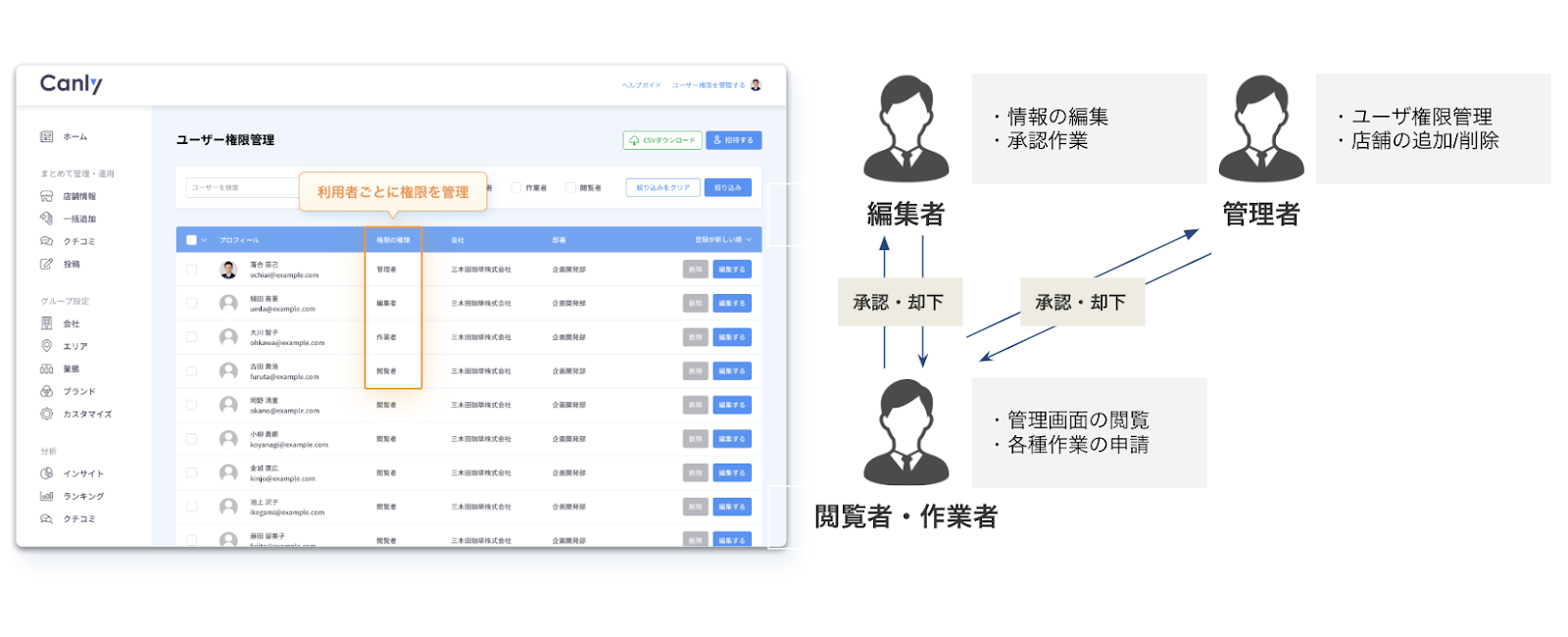 さらに、Canlyではワークフロー機能を実装しており、「管理者」「編集者」「閲覧者」「作業者」とシステムの権限を分けることが可能です。