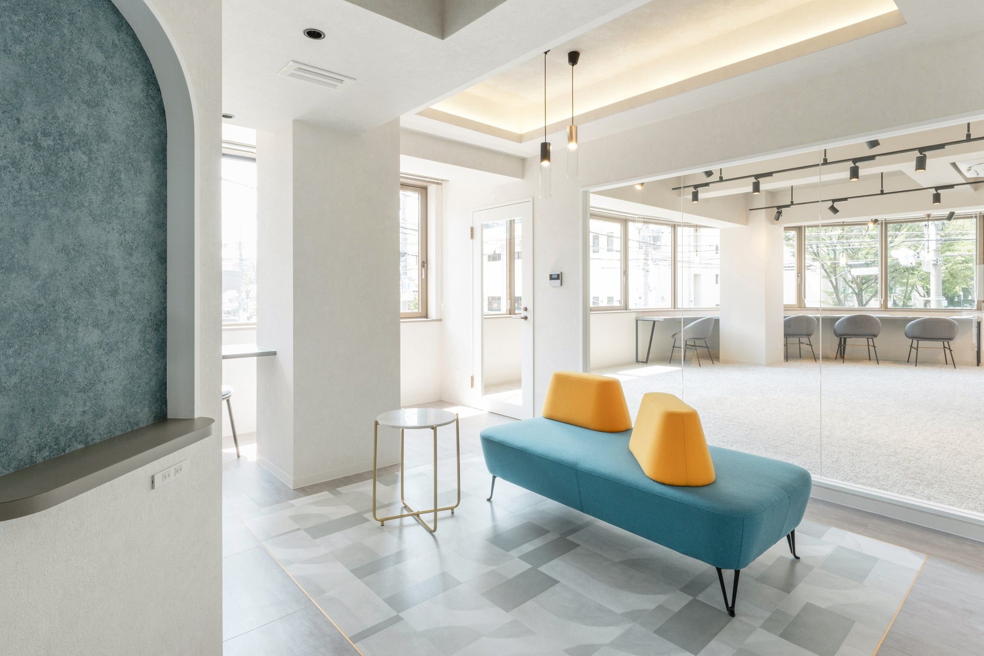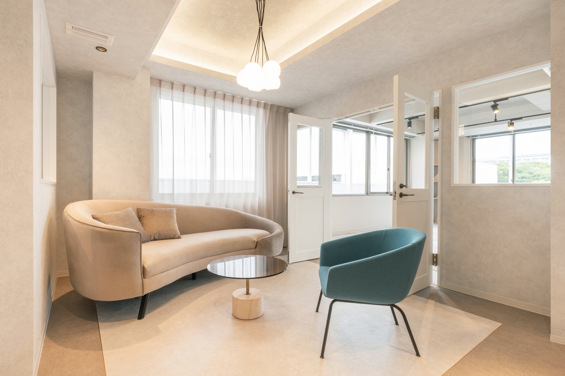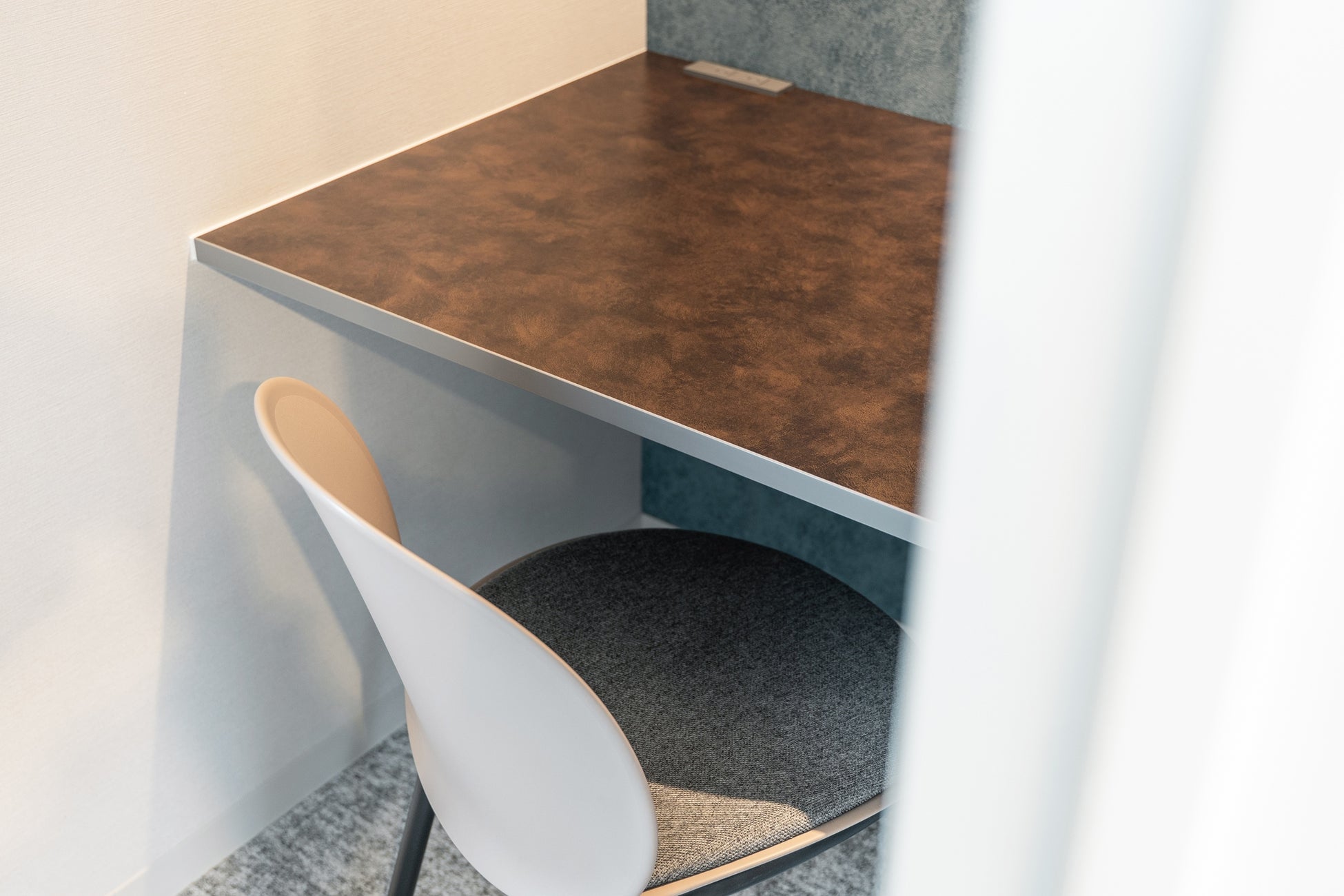 貸室内はブティックホテルのようなラウンジや水回りとシンプルかつ機能性のある執務室で、コンパクトながらもメリハリのある空間に仕上がります。