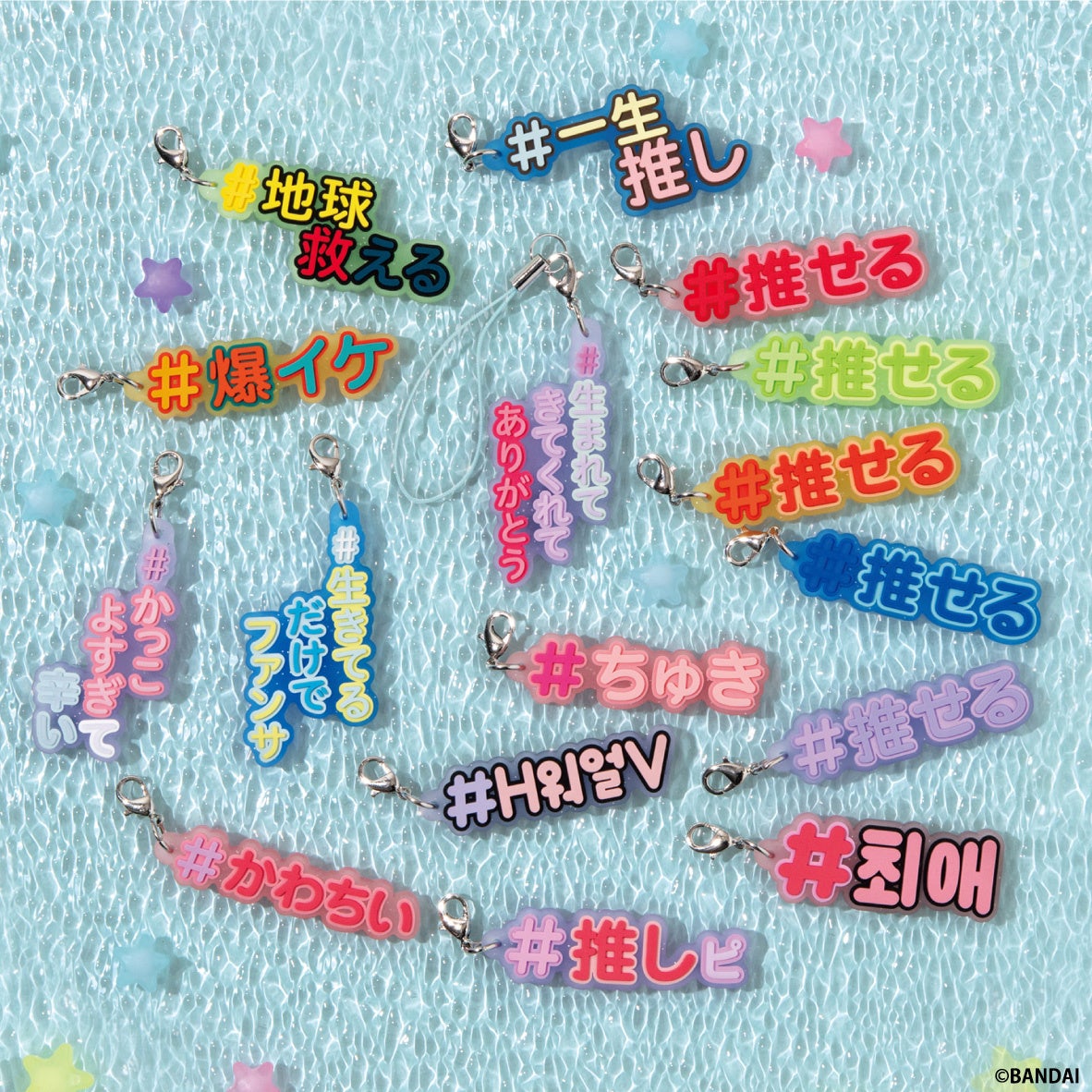 ラインアップ | 全 16 種 ① #推せる(クリアパープル) ② #推せる(クリアグリーン) ③ #推せる(クリアブルー) ④ #推せる(クリアオレンジ) ⑤ #推せる(クリアレッド) ⑥ #かわちい ⑦ #推しピ ⑧ #爆イケ ⑨ #ちゅき ⑩ #一生推し ⑪ #地球救える ⑫ #生まれてきてくれてありがとう ⑬ #生きてるだけでファンサ ⑭ #かっこよすぎて辛い ⑮ #H워얼V ⑯ #최애 |