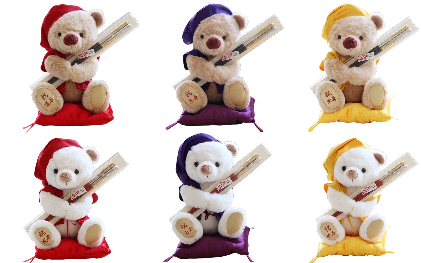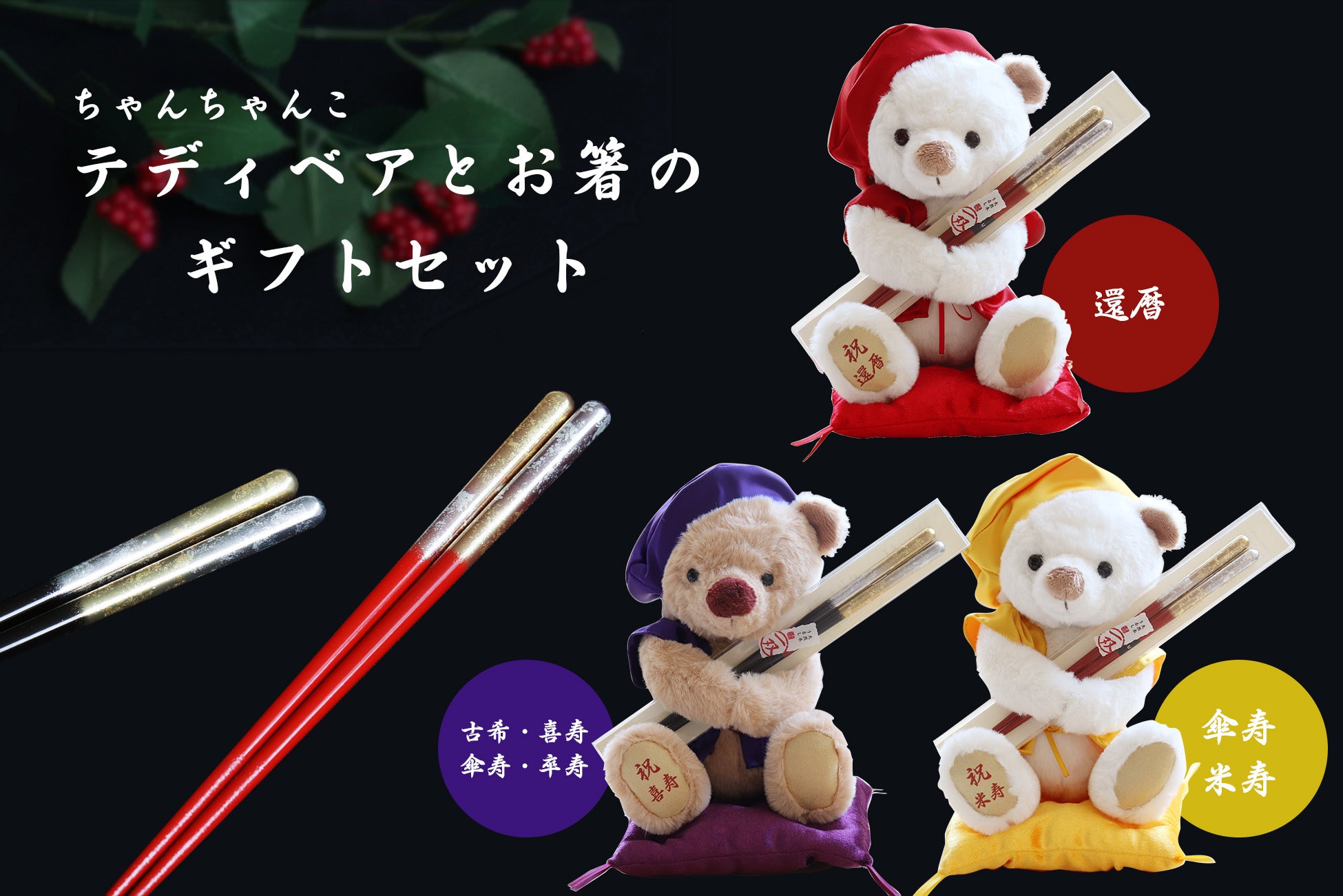 還暦(赤)、古希(紫)、米寿(黄)など、それぞれの節目を象徴するちゃんちゃんこを纏ったテディベアと、日本の匠が手掛ける「祝い箸」を組み合わせた本シリーズは、2025年の発売以来「思い出に残るだけでなく、毎日使える」と多くの支持をいただいています。