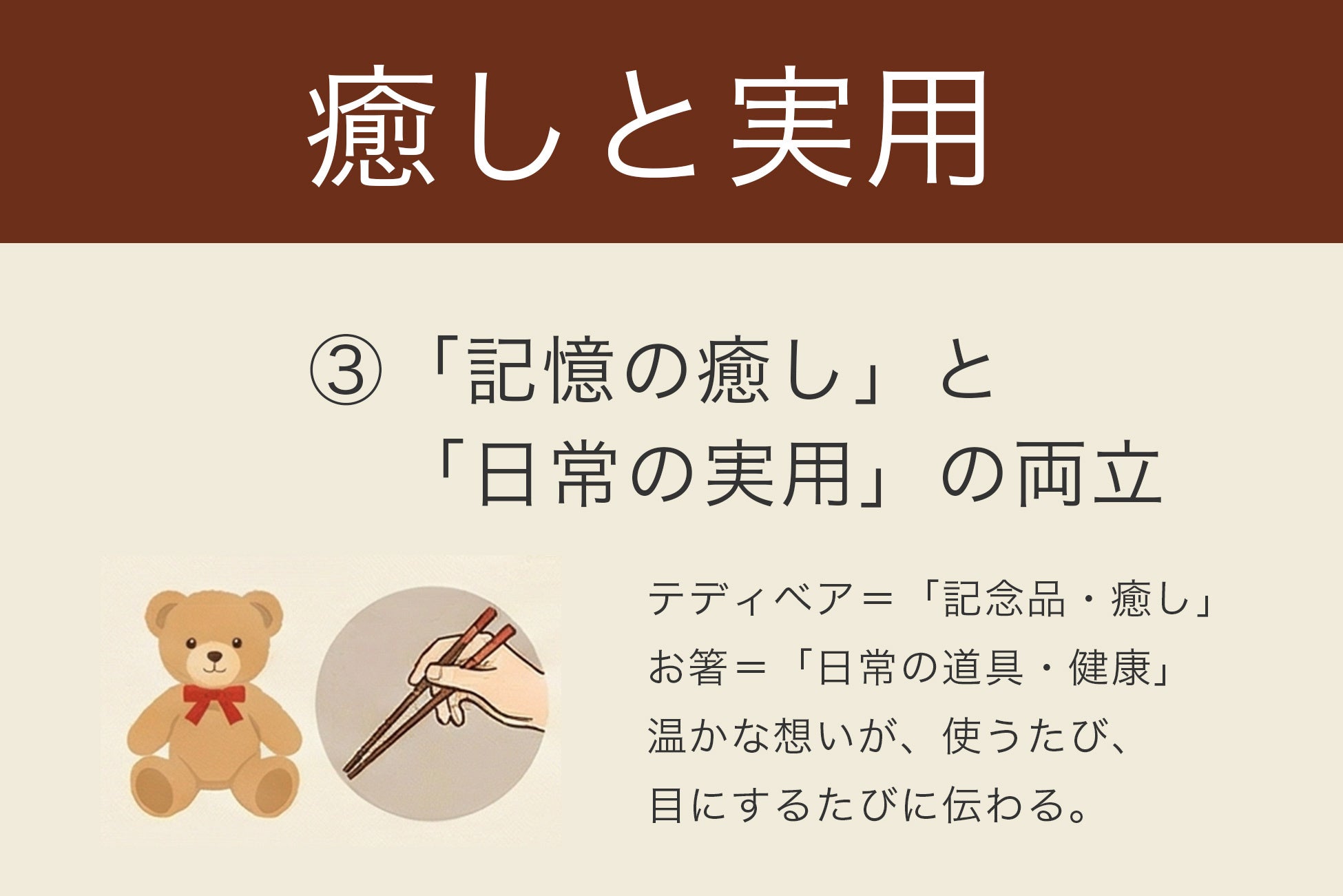 テディベアは「その日の感動を形に残す記念品」として。お箸は「これからの健康を支える道具」として。この2つがセットになることで、贈り主の温かな想いが、使うたびに、そして目にするたびに伝わります。