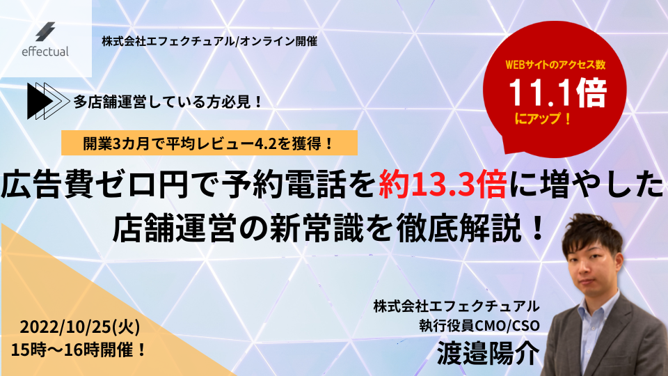 【多店舗運営企業必見!集客支援セミナー】広告費ゼロ円で予約電話を約13.3倍に増やした店舗運営の新常識を徹底解説!ー2022年10月25日開催 ー