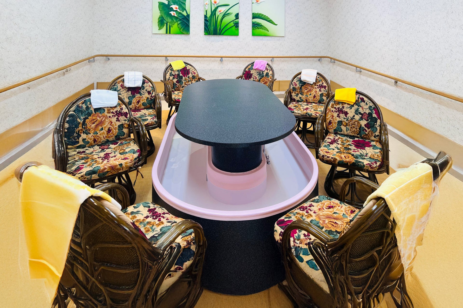 施設内には気軽にご利用いただける足湯も完備しています。雨の日でも気兼ねなく利用でき、利用者同士の会話が自然と生まれる憩いの場となっています。