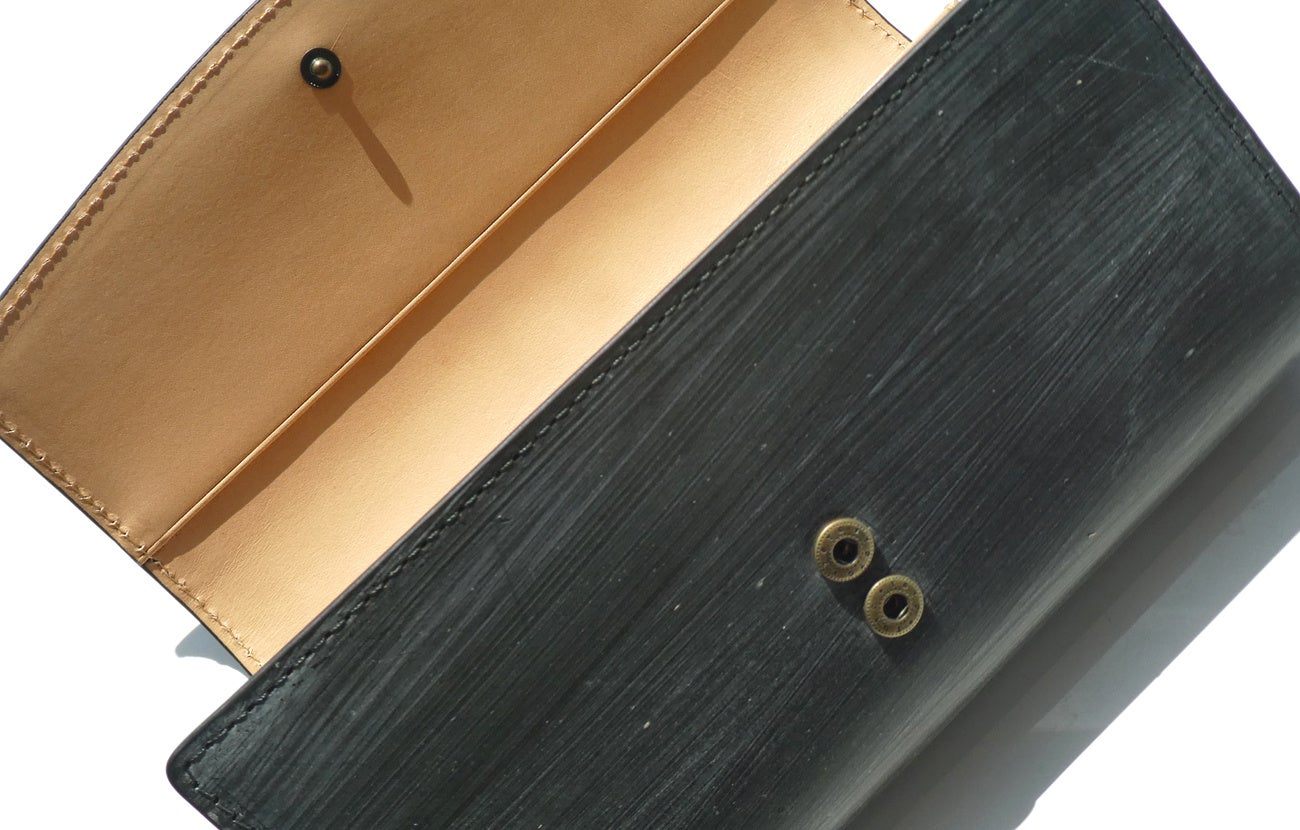 華美を求めるのではなく、堅牢度を求める結果なのですが、この革本来の繊維が緻密で強い上に、表面を磨いた艶光りと蜜蝋が浮き出す様は独特です。