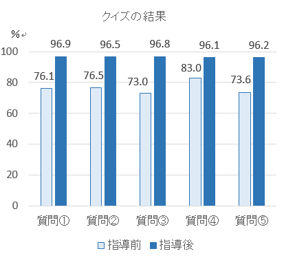 指導の前後に、手を洗うタイミングや手の洗い方を問うクイズを実施したところ、すべての設問において、実施後の正解率が95%以上と、実施前と比較して大きく向上しました。