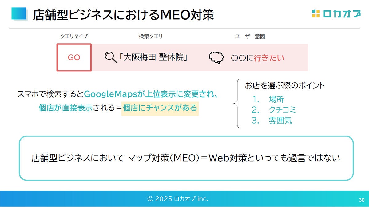 続くパートでは、SEOとMEOを分けて考えるのではなく、「ユーザーにとって役立つ情報か」「信頼して選べる内容になっているか」という共通の視点で整えていく重要性が語られました。