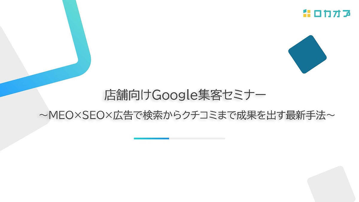 株式会社ロカオプ(本社:東京都新宿区新宿 代表取締役:縣将貴、以下:ロカオプ)は、無料のオンラインセミナー『店舗向けGoogle集客セミナー ~MEO×SEO×広告で検索からクチコミまで成果を出す最新手法~』を11月18日(火)・11月26日(水)に開催いたしました。本レポートではその内容の一部を抜粋してご紹介します。