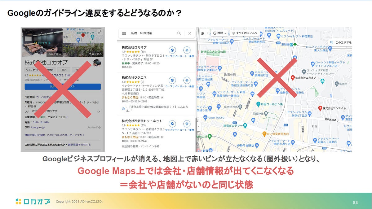 また、運用面での注意点として、Googleビジネスプロフィールの名称や業種の設定方法、クチコミへの関わり方など、知らないうちにルール違反になりやすい項目にも触れられました。特に、誤った名称設定や不自然なクチコミ依頼によって掲載停止になるケースもあるため、日常の運用ほど正しいルールの理解が欠かせないという内容です。