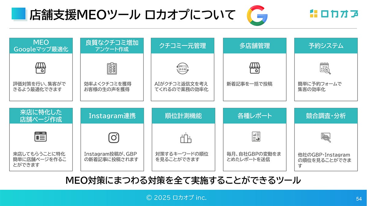 セミナーでは、Googleマップ運用を日常業務の中で無理なく続けるための手段として、店舗支援ツール「ロカオプ」も紹介されました。Googleビジネスプロフィールの更新、クチコミ対応、写真や投稿の管理など、店舗数が増えるほど負担が大きくなる作業を一つにまとめて扱える点が特徴です。