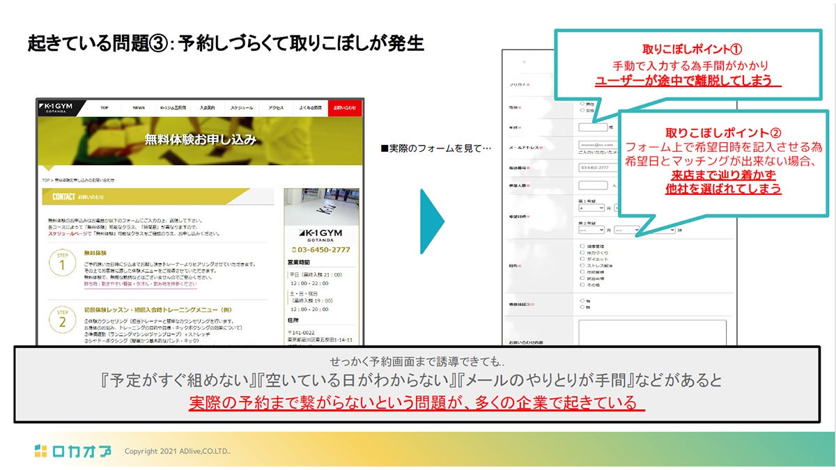 ユーザーがフォーム入力を負担に感じたり、返信までの時間に不安を覚えたりと、来店前の小さなストレスが積み重なると、せっかく興味を持った人でも離脱してしまうという視点が共有され、実際のフォーム例や調査データを交えながら、「入力項目の多さ」「返信までの時間」「希望日時の不一致」など、見落とされがちな課題を一つずつ解説。とくに、問い合わせ後の対応速度が信頼感に直結する点や、ユーザーが迷わない導線づくりの重要性が強調されました。