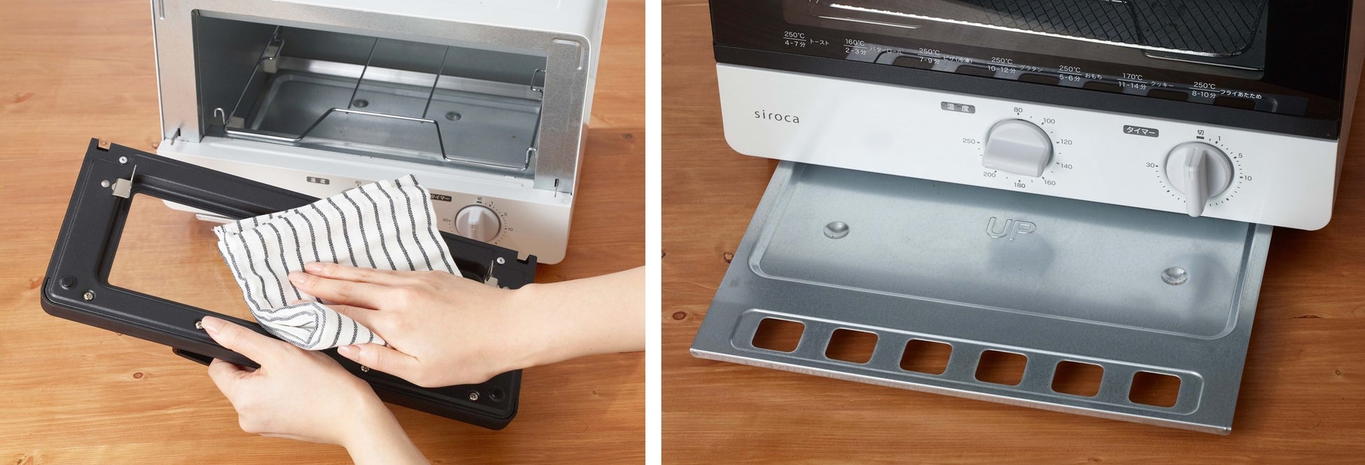 毎日お使いいただくものだからこそ、清掃性にもこだわっています。とびらとパンくずトレーは取り外すことができるので、お手入れ簡単でいつでも清潔にお使いいただけます。