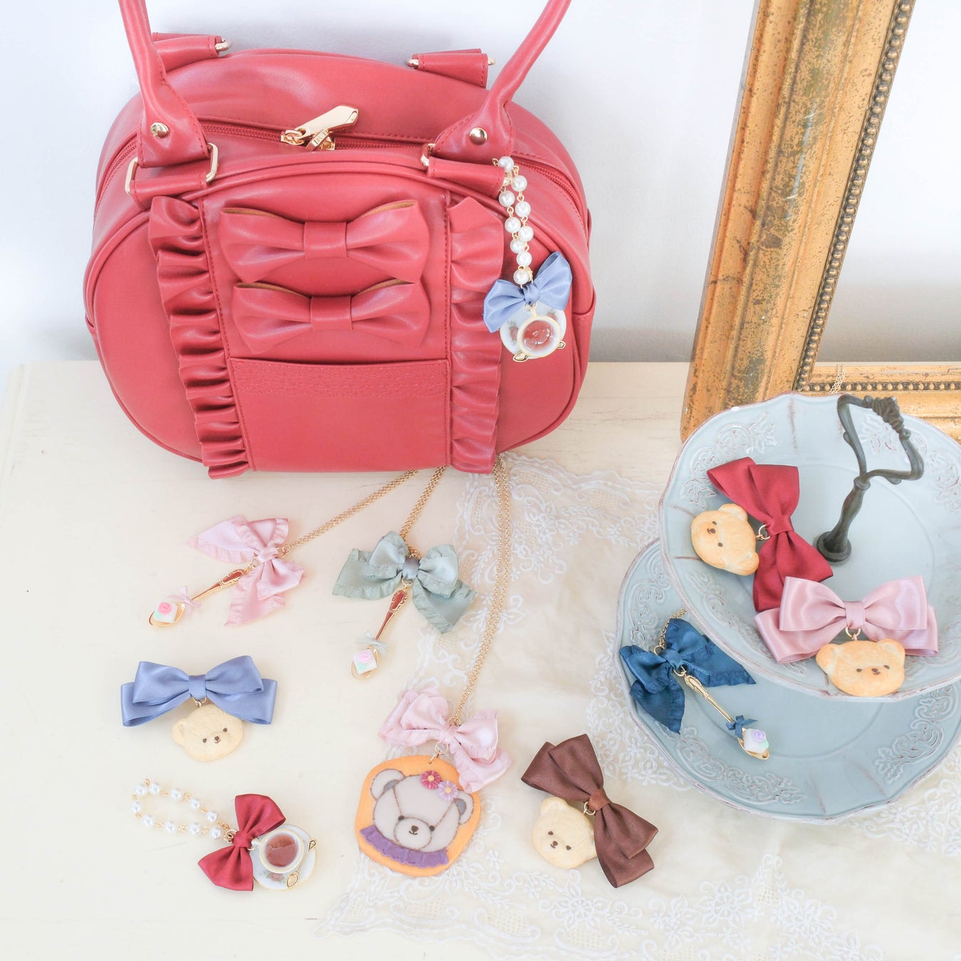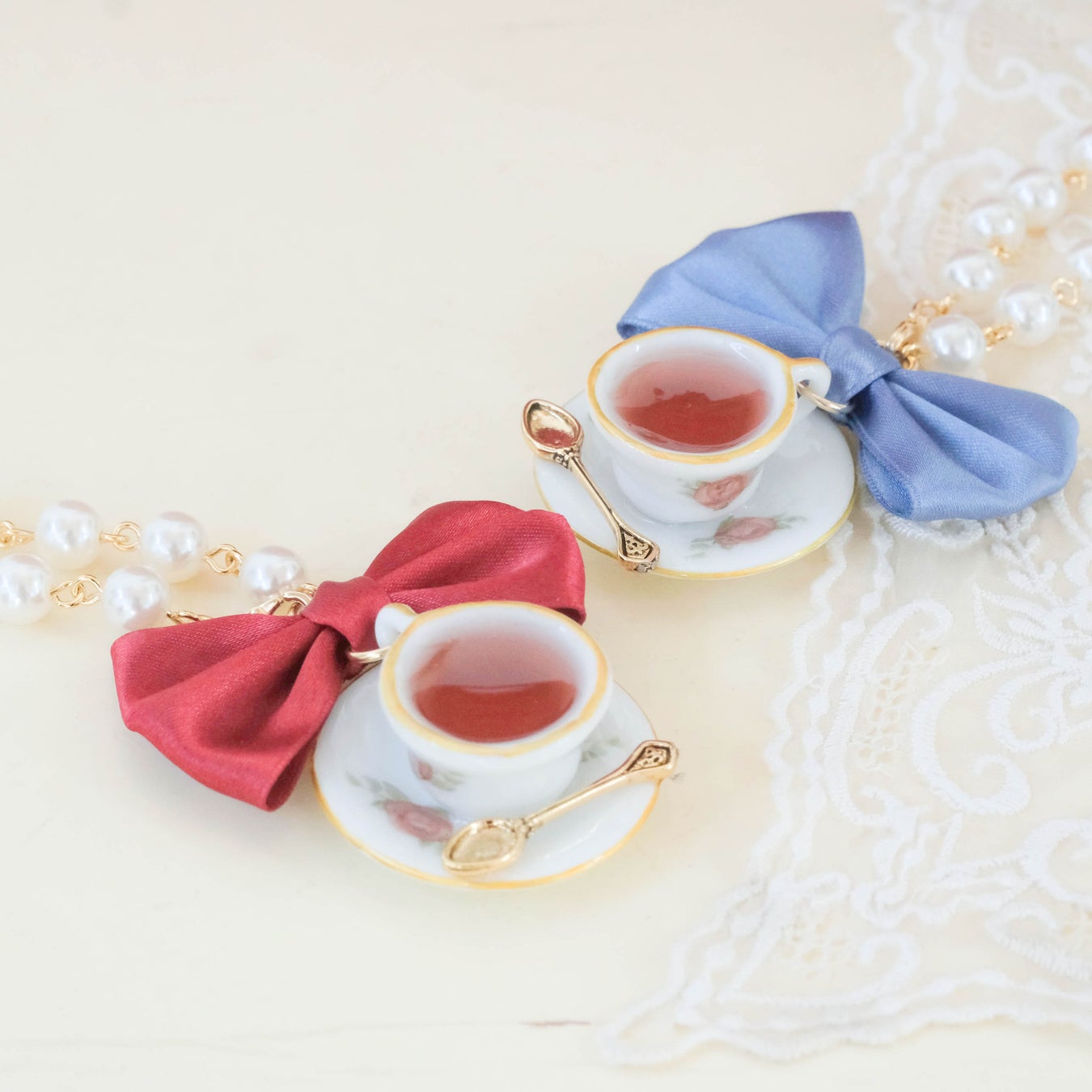 オリジナルプリント柄に描かれているティーカップを再現したバッグチャームです。カップ&ソーサーの柄まで忠実に再現し、注がれた紅茶からは良い香りが漂ってきそう!チェーンはパールになっており、サテンリボンもあしらわれた可愛らしいアイテムです。