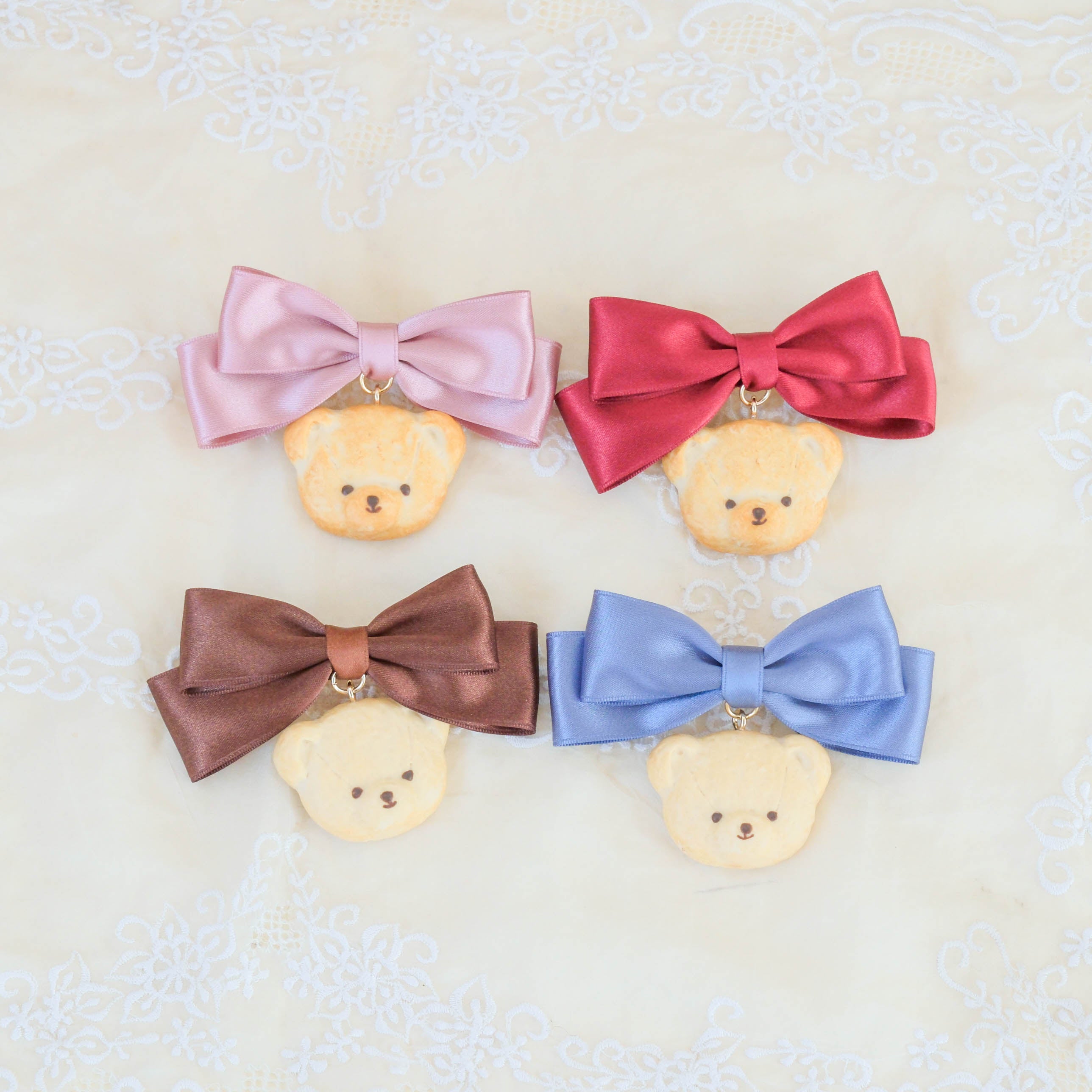 オリジナルプリント柄に描かれているクマたちをクッキーで表現したリボンバレッタです。甘い香りが漂ってきそうなクマのクッキーは、ブルーと茶色のリボンにはバニラクッキー、ピンクとワインのリボンには少しこんがりとしたクッキーの2種類があります。ツインテールにして2つ付けるのもおすすめです。