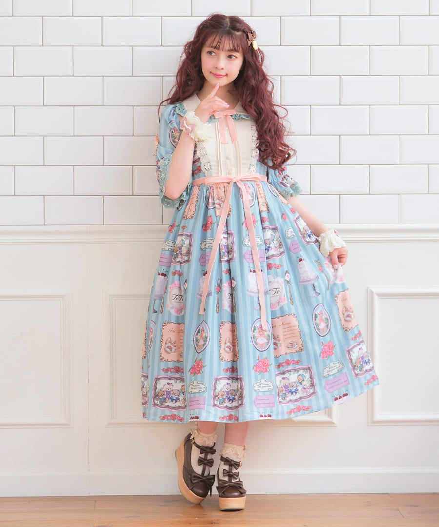 クマのぬいぐるみ一家や美味しそうなスウィーツ、お花などを描いたちょっぴりカントリーな雰囲気のオリジナルプリント柄のワンピースです。胸元は無地のヨーク切り替えになっており、ネックレスが主役になれるデザインです。ぜひお揃いでご着用ください!