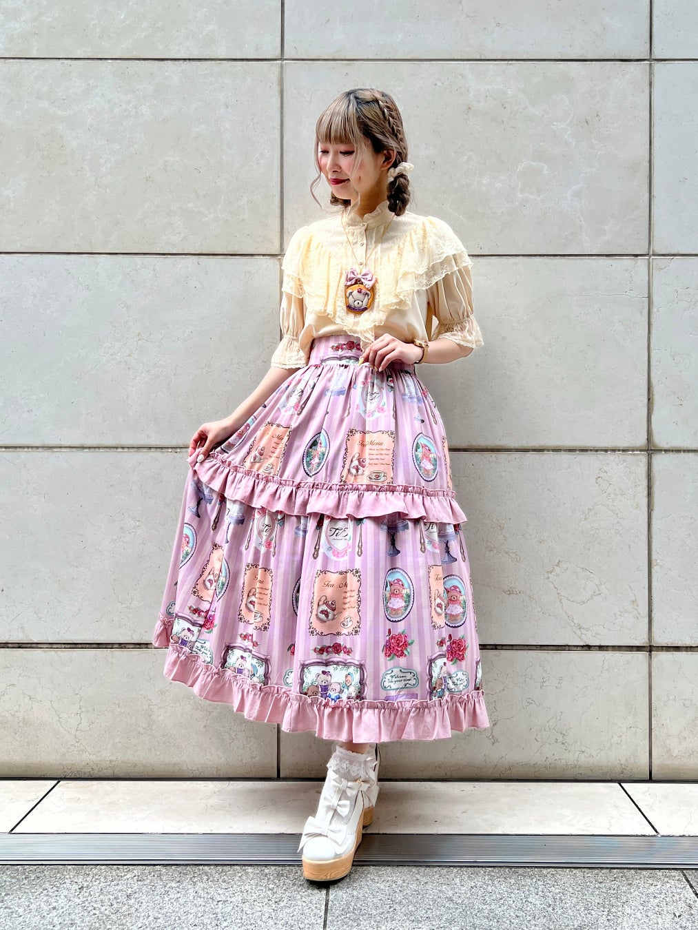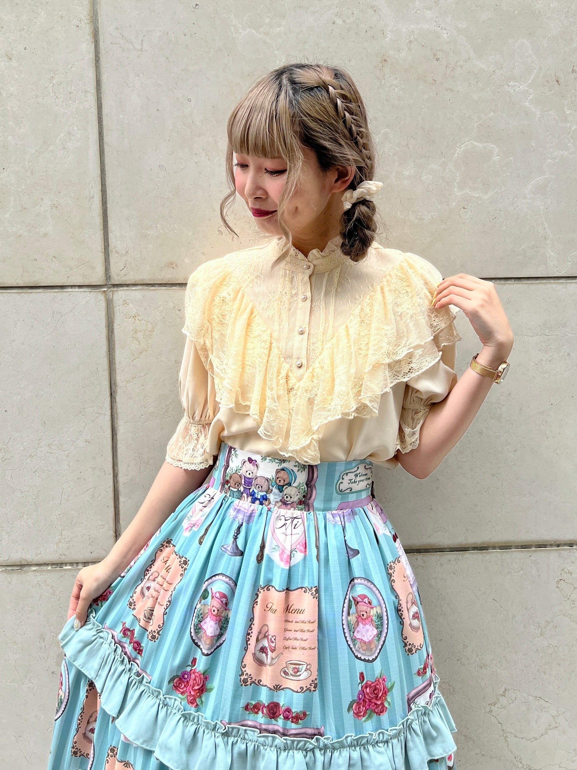 クマのぬいぐるみ一家や美味しそうなスウィーツ、お花などを描いたちょっぴりカントリーな雰囲気のオリジナルプリント柄のロングスカートです。ブラウスとの相性はもちろん、ビスチェなどを合わせてよりカントリーな雰囲気にコーデするのもおすすめです。