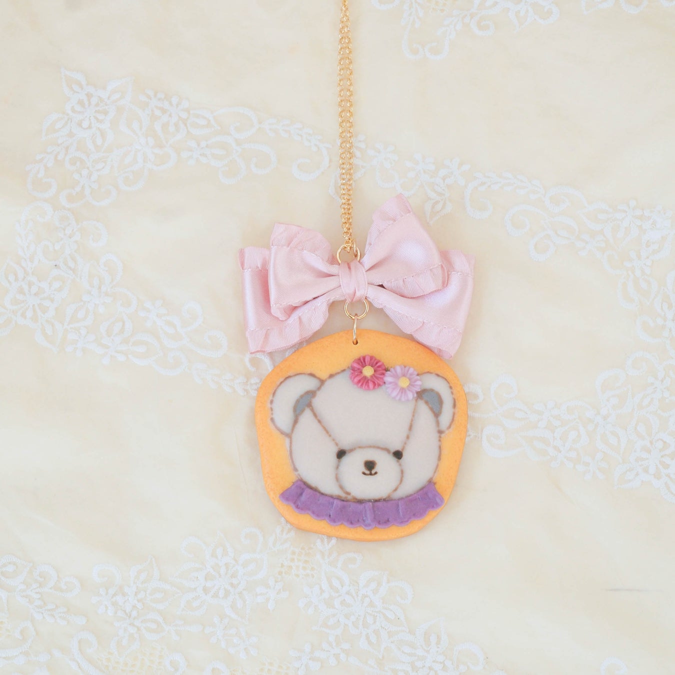 オリジナルプリント柄に描かれているクマの家族写真の女の子のクマを再現したネックレスです。アイシングクッキーに描かれたクマの女の子にはチョコレートのお花や立体的なフリルがあしらわれています。まるで本物のようなクッキーをネックレストップにした美味しそうなアイテム。大き目のサイズ感でコーデのポイントになります。