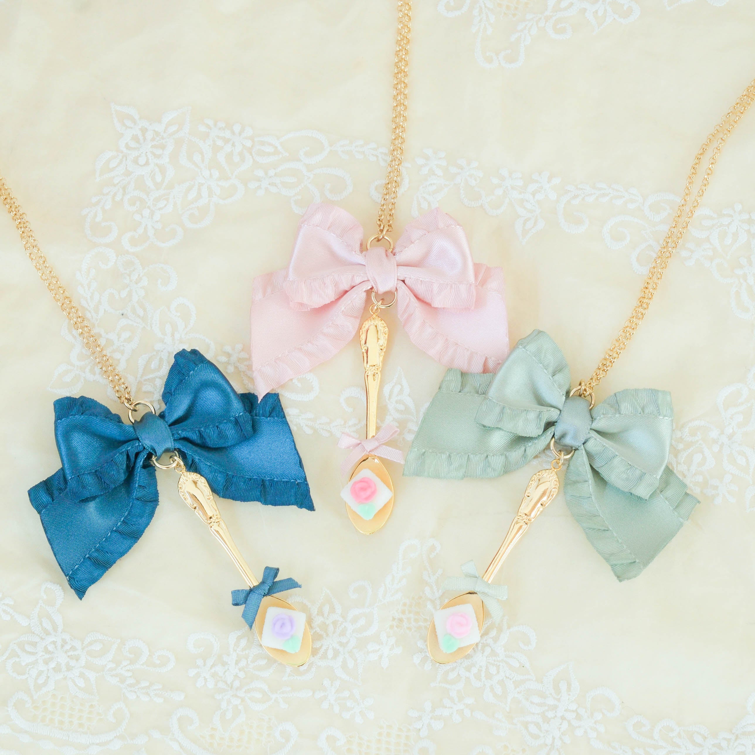 オリジナルプリント柄に描かれているスプーンを再現したネックレスです。まるで本物のような真っ白な角砂糖にはちょこんとシュガーフラワーのバラがあしらわれています。大き目のフリルリボンがあしらわれており、コーデのポイントになるアイテムです。