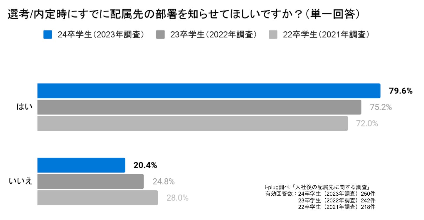 79.6%の学生が「はい」と回答しました。昨年、23卒学生へ実施した調査と比較すると4.4ポイントの増加。一昨年、22卒学生へ実施した調査と比較すると、約8ポイント増加しており、選考/内定時に配属先を知りたい学生が増加傾向にあることがわかりました。