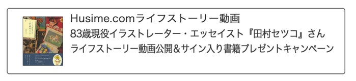 <HusimeTV 田村セツコさんライフストーリー>動画の感想文をお寄せいただいた方から10名様にプレゼントいたします。応募詳細はキャンペーン特設サイトをご覧ください。⇒https://husime.com/campaign/book-gift/
