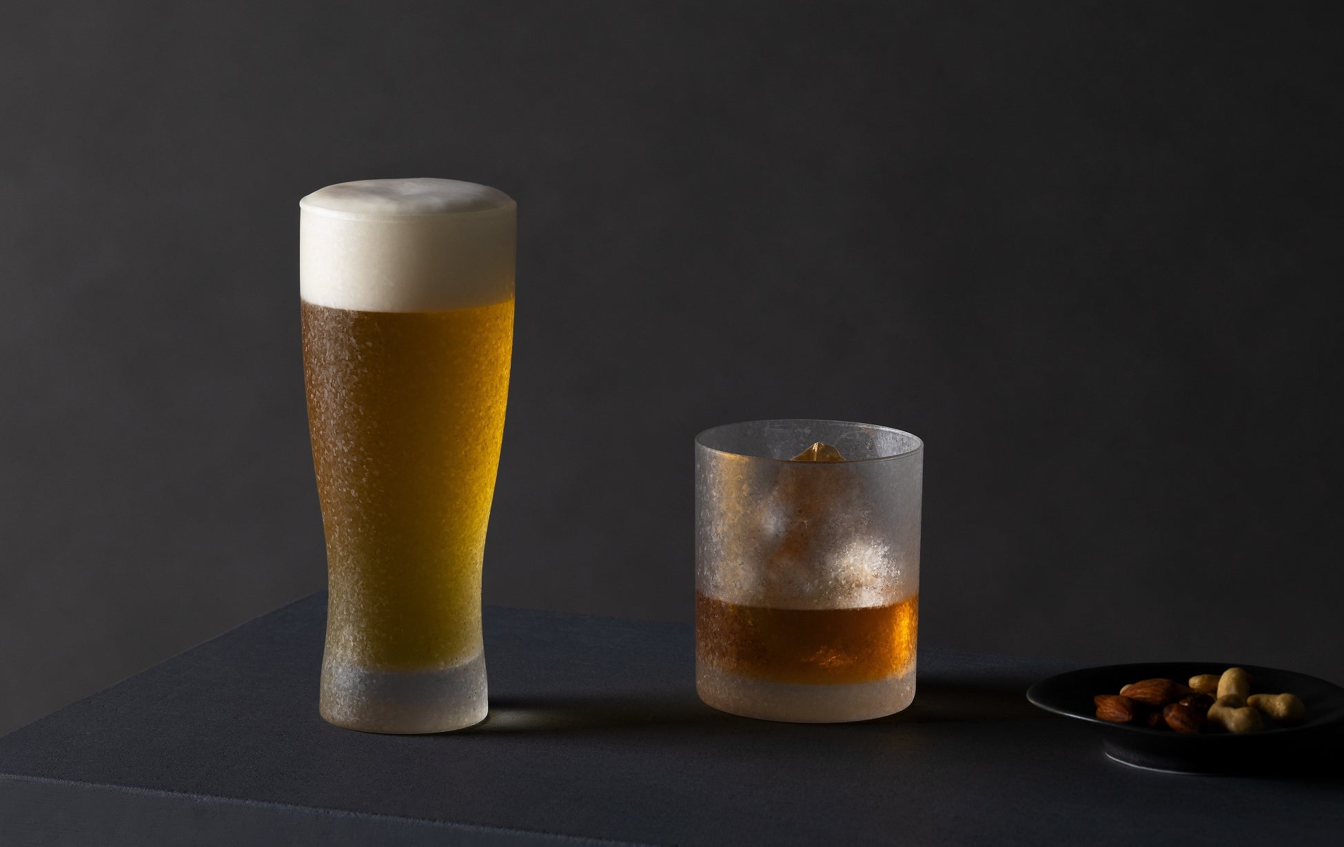 『アデリアみぞれ』は、グラス表面に繊細な「みぞれ加工」を施した、新しいシリーズです。光を柔らかく反射するきらめきが、飲みものの美味しさや楽しさを一層引き立てます。ラインナップは全10種。ビールやワインなどのアルコール類はもちろん、ジュースやコーヒーなどさまざまな飲みものにも幅広く対応し、日常のあらゆるシーンに寄り添います。あえて柄や装飾を施さず、みぞれの表情そのものをデザインとして生かしたシンプルモダンな佇まいが魅力。上質で洗練された印象ながらも主張しすぎず、食卓やインテリアにすっと馴染み、使うほどに愛着が深まるグラスです。