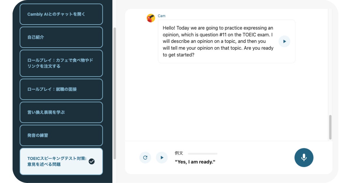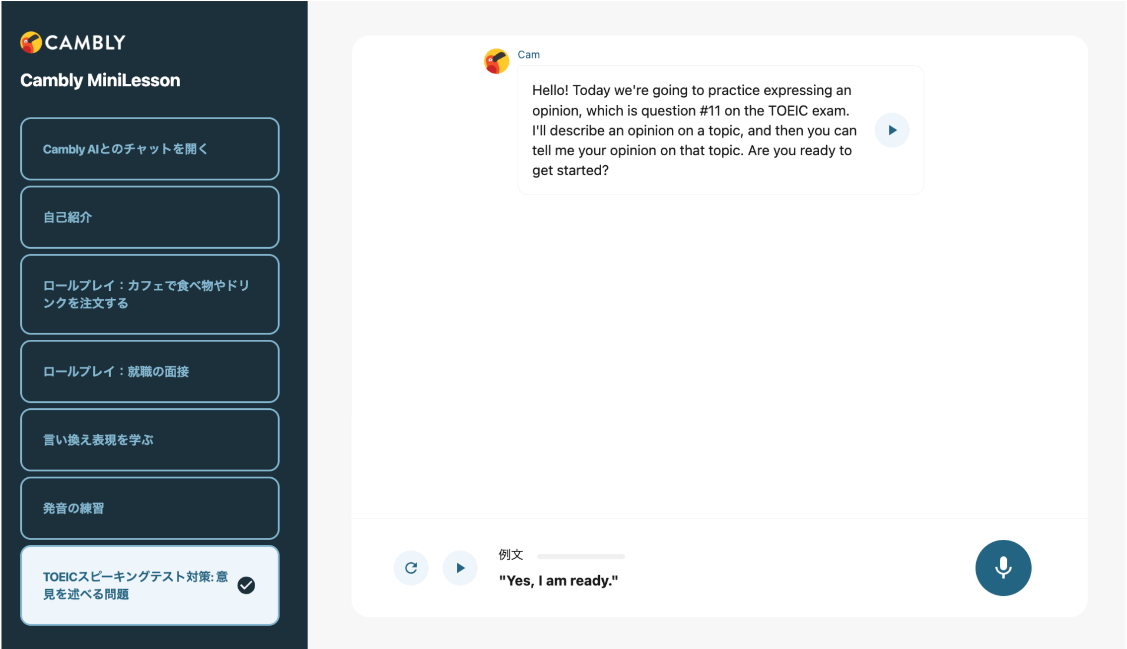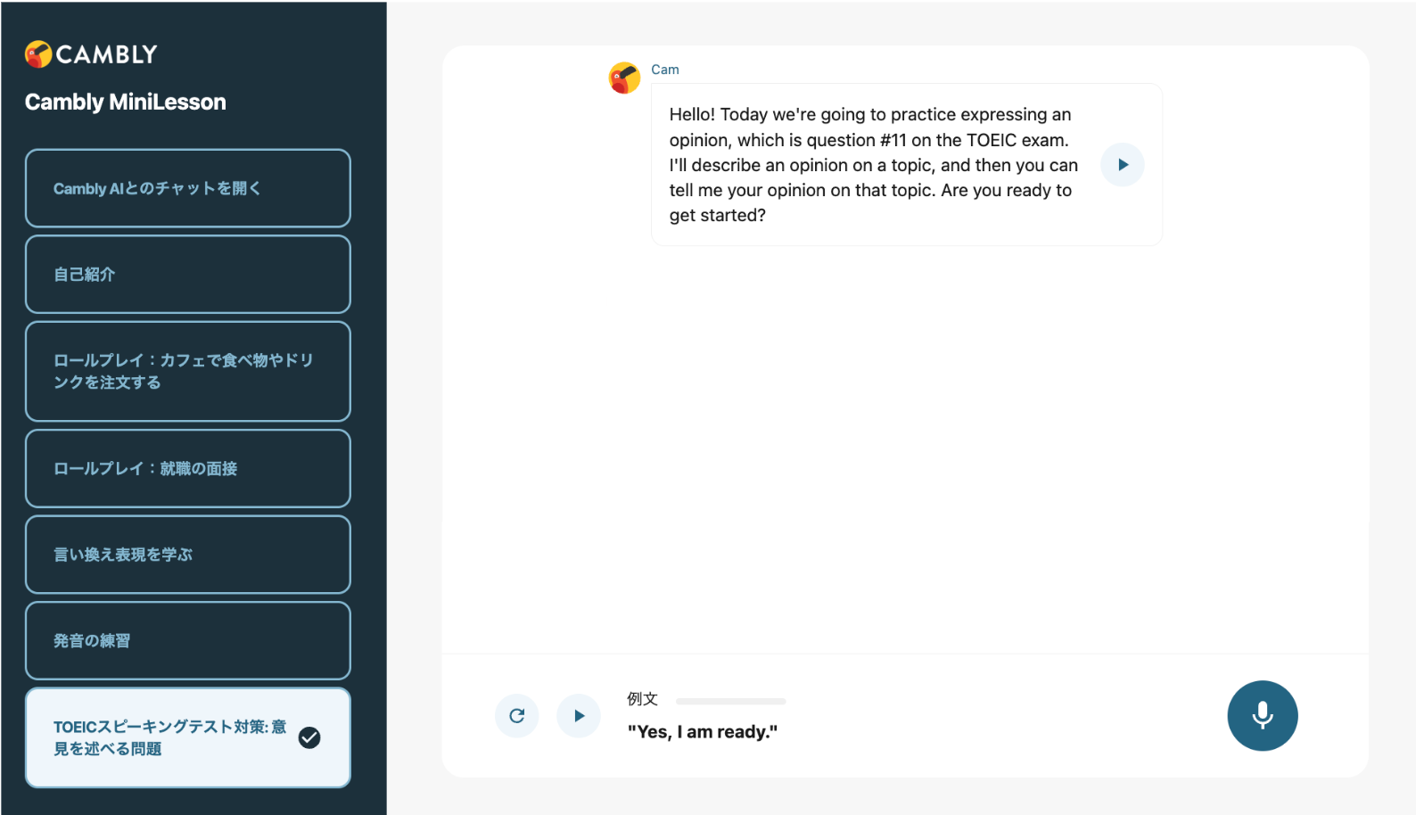 そんなCambly AIに、この度TOEICスピーキングテストのQuestion11に準じた形式で練習ができるミニレッスンが追加されました。Cambly AIがトピックを提案し、それに対して自分の意見を回答する練習ができます。また自分の回答に対して、正しい英語が使えているか、より自然な言い回しに言い換えができる部分はないかなど、英語のブラッシュアップにもご利用いただけます。