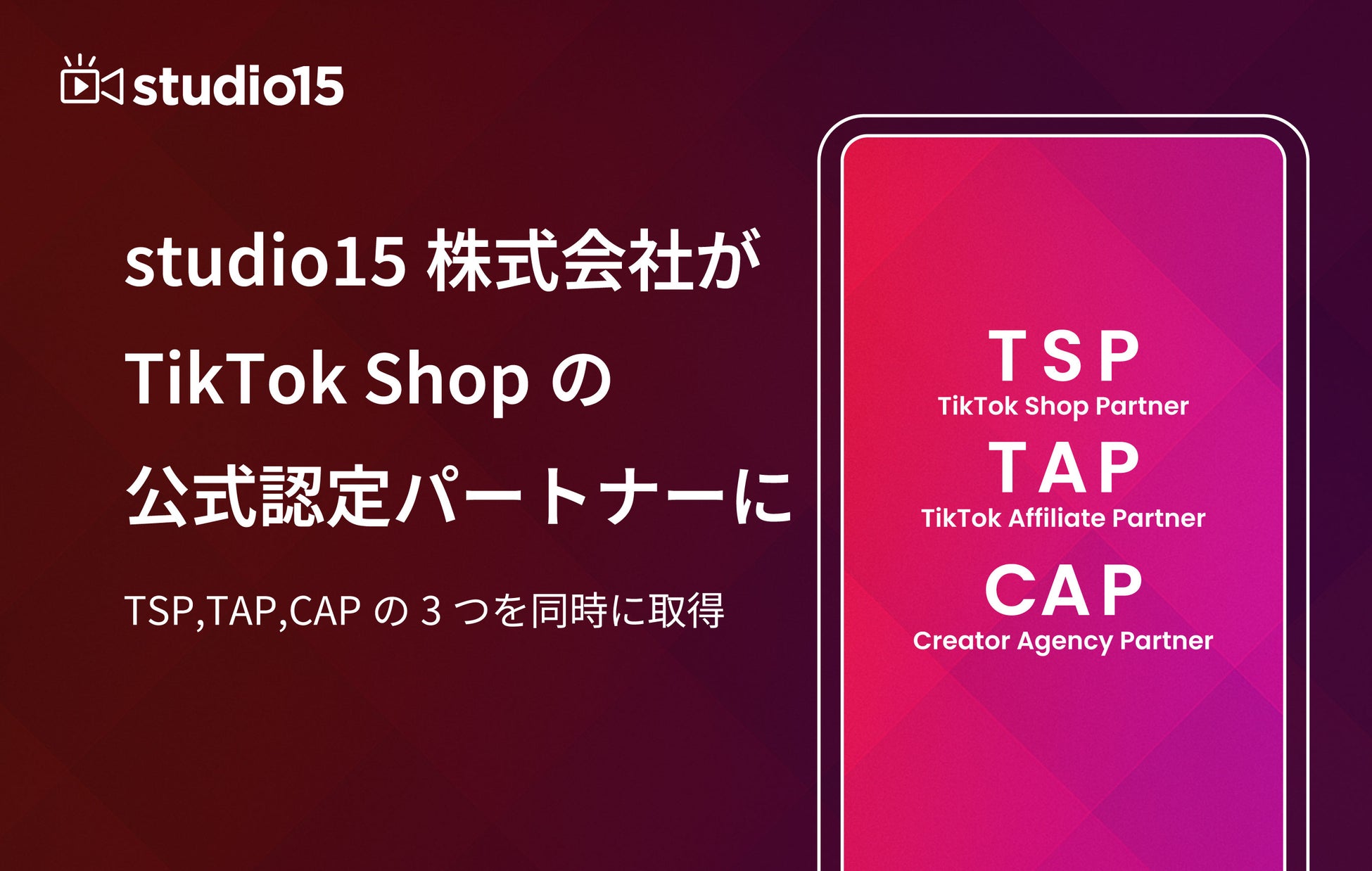 ショートムービー(短尺動画)領域で広告代理店事業・プロダクション事業を展開するstudio15株式会社(本社:東京都渋谷区、代表取締役:岩佐 琢磨、読み:スタジオフィフティーン、以下 studio15)は、TikTok Shopの公式パートナープログラムにおいて、「TikTok Shop Partner(以下、TSP)」、「TikTok Affiliate Partner(以下、TAP)」、そして「Creator Agency Partner(以下、CAP)」の3種に認定されたことをお知らせいたします。