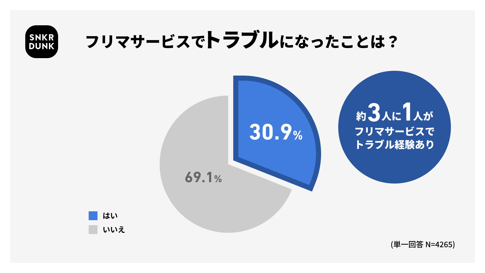 調査の結果、フリマサービス利用者の30.9%が何らかのトラブルを経験していることが判明しました。特に購入者側でのトラブルが(14.5%)と最も多く、出品者側でのトラブル(8.4%)、購入・出品両方でのトラブル(8.0%)と続いています。