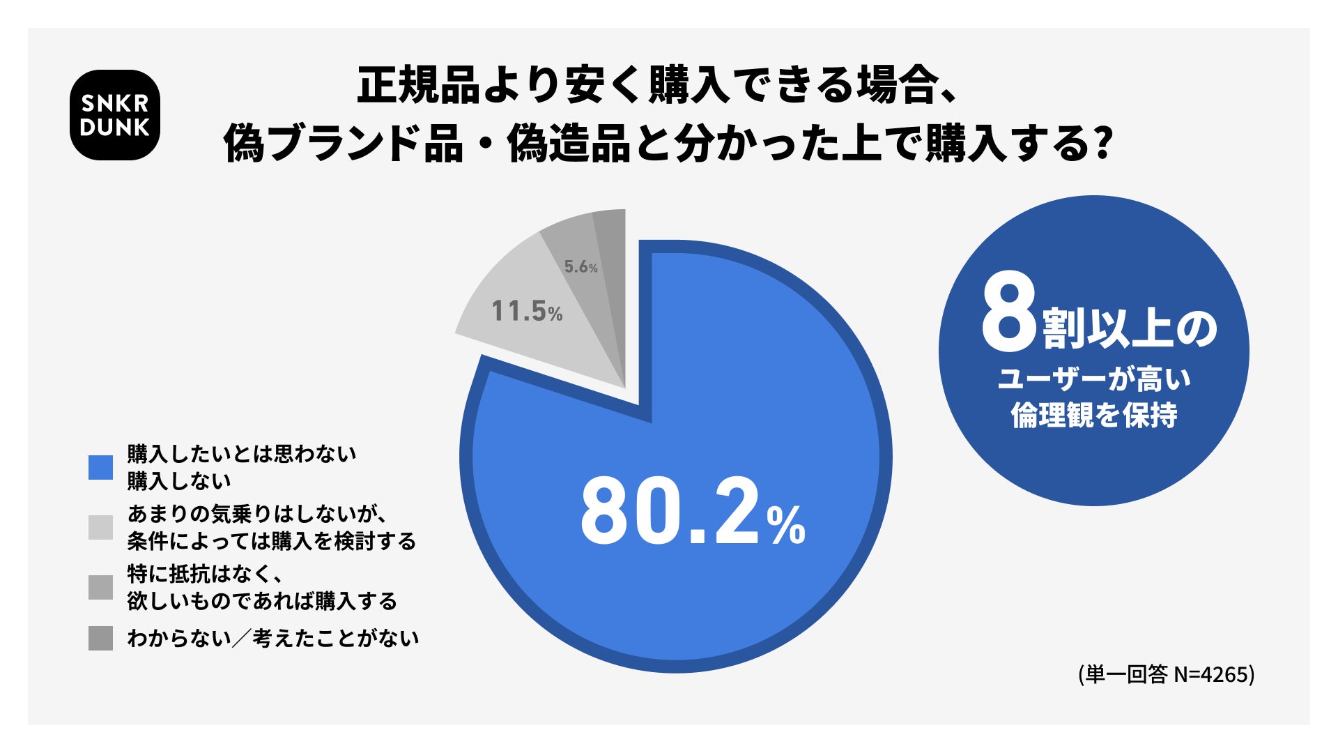 「正規品より安く購入できる場合でも、偽造品とわかった上では購入しない」と回答した利用者は全体で80.2%となり、多くのユーザーが高い倫理観を持っていることも明らかになりました。