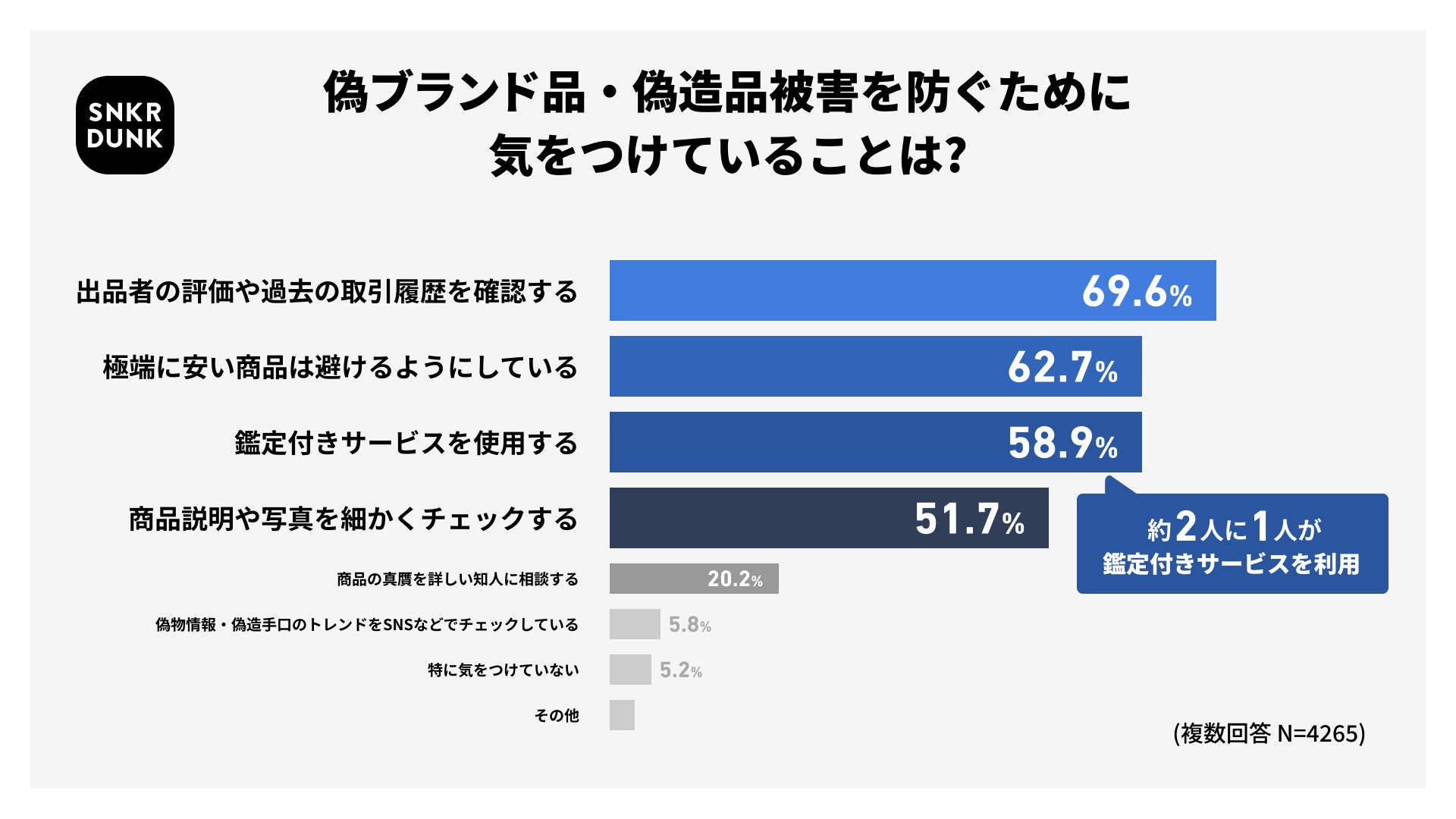 約2人に1人が偽ブランド品・偽造品購入の被害を防ぐため「鑑定付きサービスを利用している」と回答しており、偽ブランド品・偽造品被害を防ぐための手段として、”真贋保証”への注目の高さが伺える結果に。