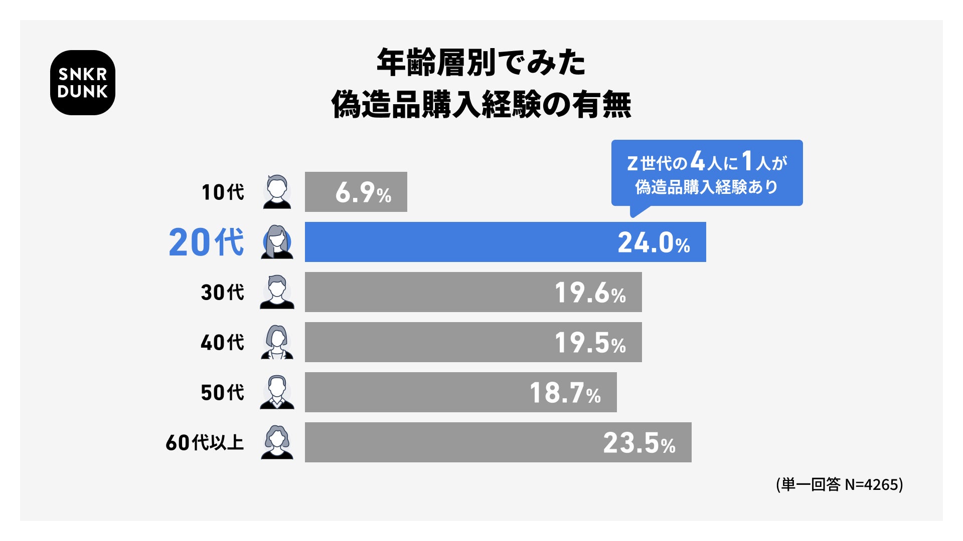 さらに、年齢層別で偽造品購入経験の有無を見てみると、特に20代(Z世代)での割合が最も高く、約4人に1人が偽造品を買ってしまっている現状が浮き彫りとなりました。「Z世代=本物志向」という通説とは逆の、“本物志向だけど見極められない”ギャップ層の存在を示唆しています。