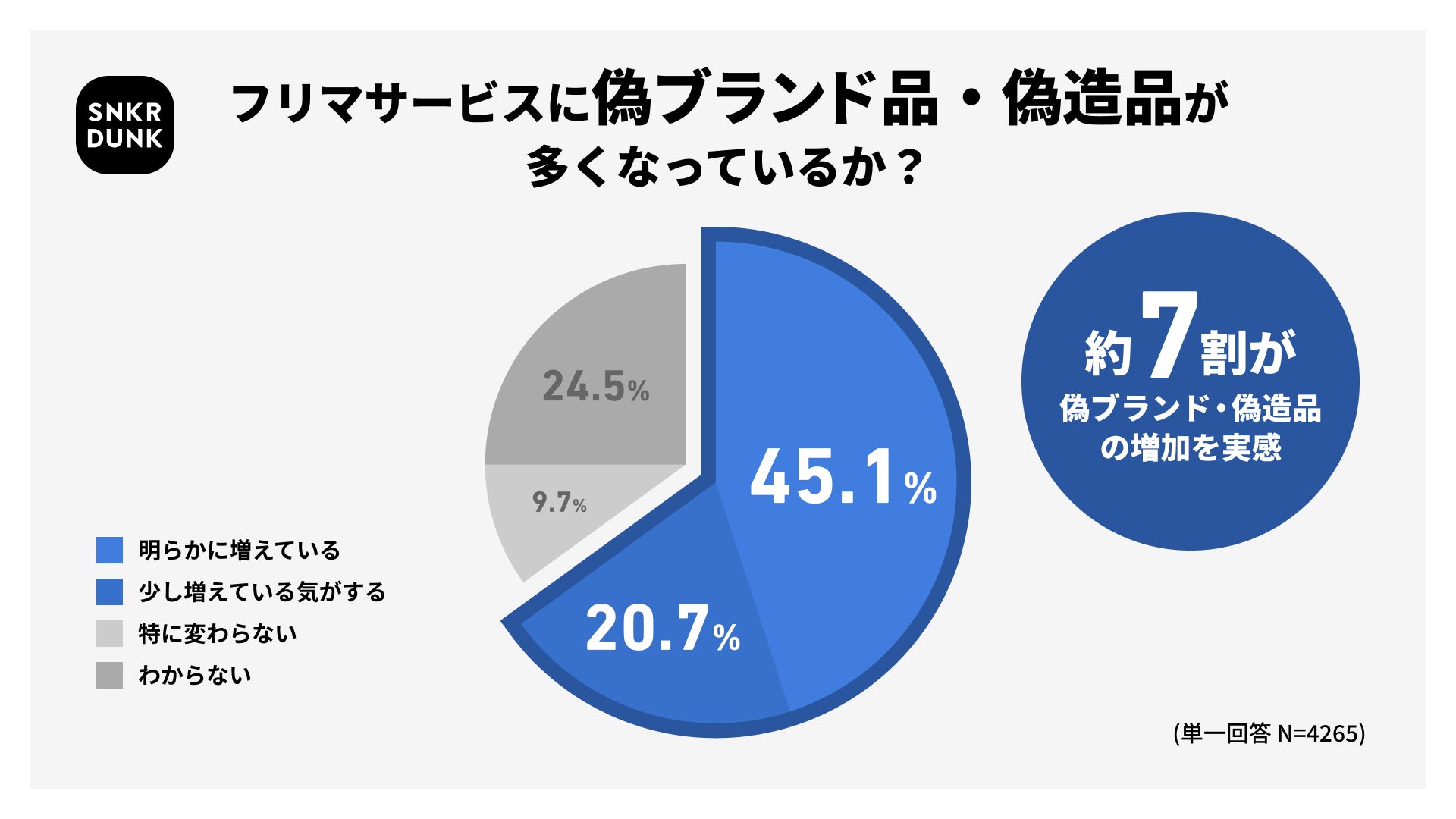 「フリマアプリ、フリマサイトを利用している中で、 偽ブランド品・偽造品が多くなっていると感じますか?」の質問に対して、65.8%の回答者が「偽造品が増えている」と回答しました。内訳としては、「明らかに増えている」が45.1%、「少し増えている気がする」が20.7%となっています。現在のフリマ市場における偽ブランド品・偽造品流通が深刻化しており、“フェイクパンデミック”が起きていると判明しました。