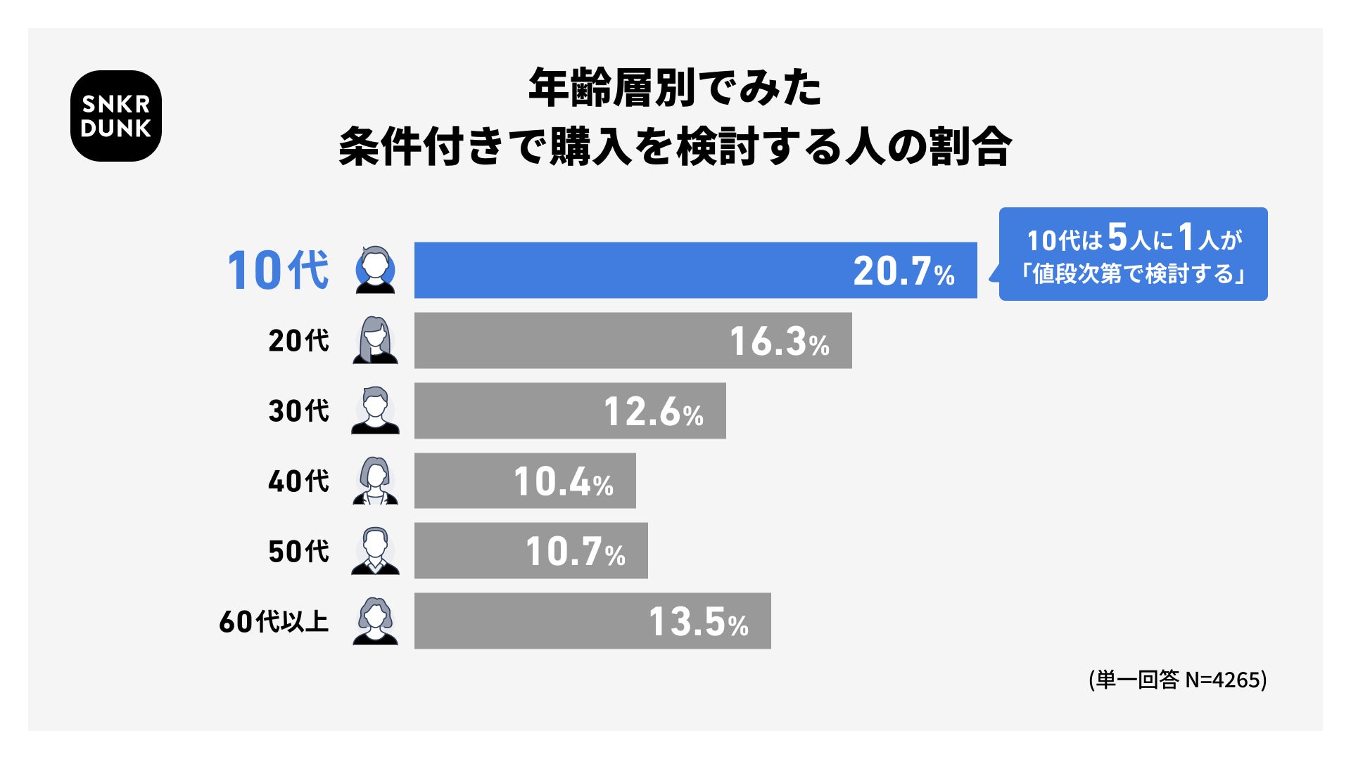 中でも「あまり気乗りはしないが、条件によっては購入を検討する」と回答した人を年齢層別で見てみると40代が10.4%、50代が10.7%に対して、10代が20.7%、20代が16.3%と若年層であるほど多いことがわかりました。比較的収入が少ない若年層は「グレーゾーン容認層」がやや多く、値段次第では偽ブランド品・偽造品でも検討してしまう、倹約のための代替手段“Dupe Culture(デュープカルチャー)”が一部浸透していることが明らかになりました。