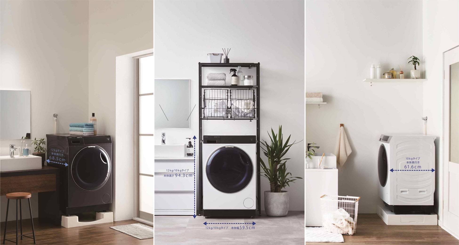 「まっ直ぐドラムシリーズ」はドラムを水平に配置することで、賃貸住宅にも設置しやすいコンパクト&大容量を実現しました。ライフスタイルから必要な容量・機能をお選びいただけるよう、ファミリーの洗濯物もおまかせの12kgタイプや1人暮らしのまとめ洗いにも適した10kgタイプをラインナップ。設置場所に合わせて、右開き/左開きドアをお選びいただけるモデルもございます。